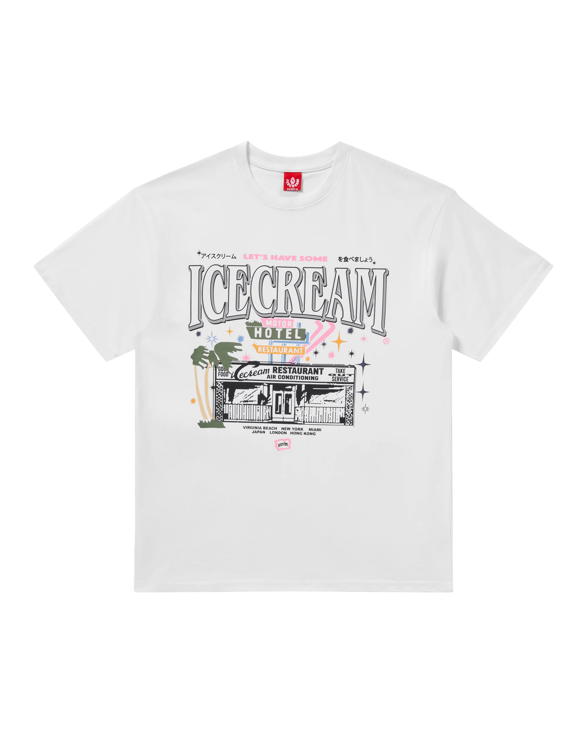 The Store Front SS Tee features a vintage diner-inspired Icecream graphic with retro motel signage, restaurant artwork, and playful color accents on the front. The back features the IC Signet. - White - Screen-printed graphics on the front and back - 100% Cotton
