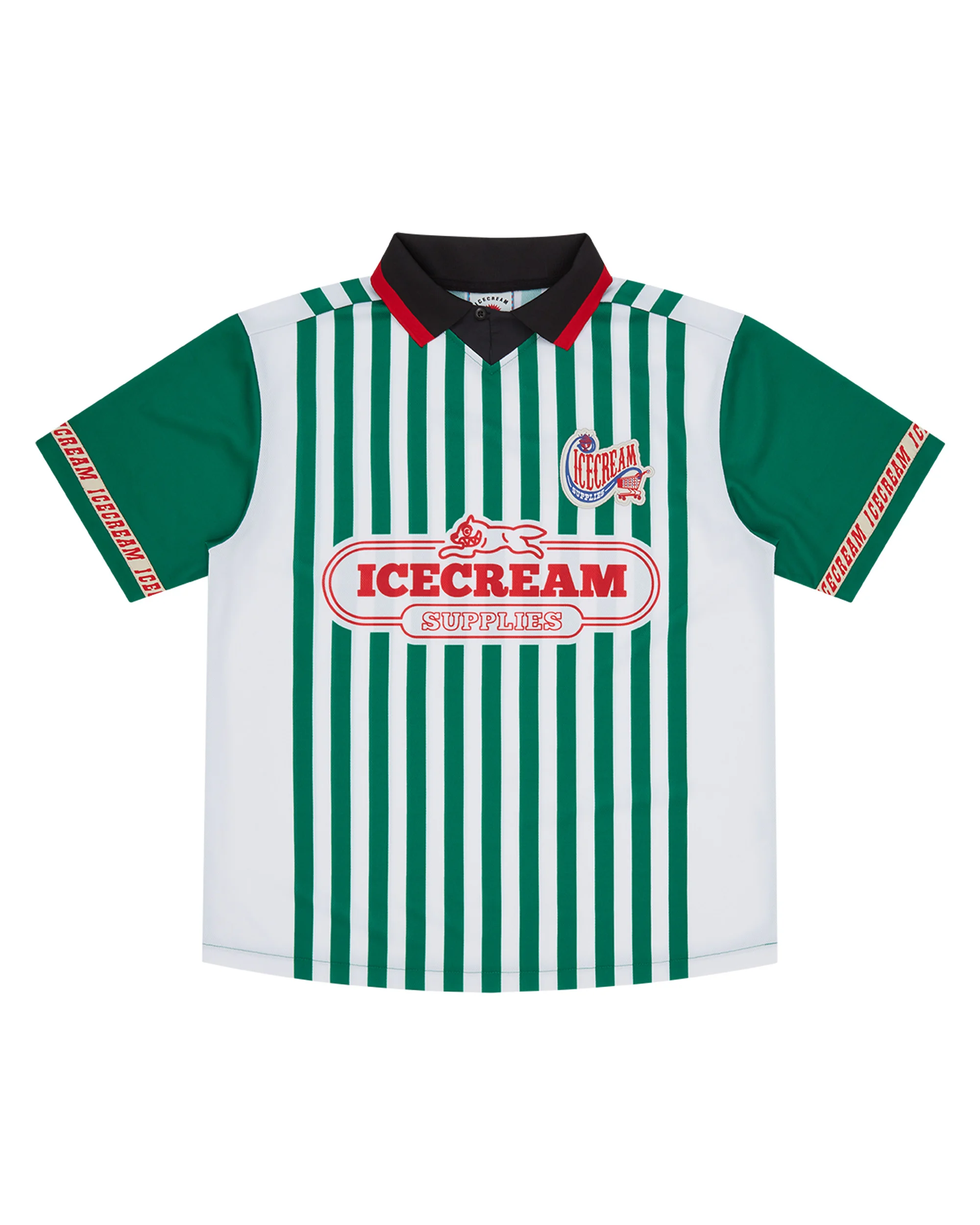 This Striped Football Shirt presents a striped digital print on the front and on the back; it is decorated with the ICECREAM convenience woven patch logo on the chest and it is detailed with the ICECREAM logo tape at the sleeves. - Green - Loose fit - Striped digital print - Contrasting collar - Woven patch ICECREAM convenience logo at front - Printed ICECREAM logo on the front - ICECREAM logo tape at the sleeve hems - 100% Polyester