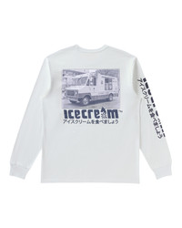 The Truck LS Knit features the Icecream logo printed on the front left chest and the right sleeve, and the back features a photograph paired with the Icecream logo at the bottom. - White - Screen printed logo on the front, sleeve, and back - 100% Cotton
