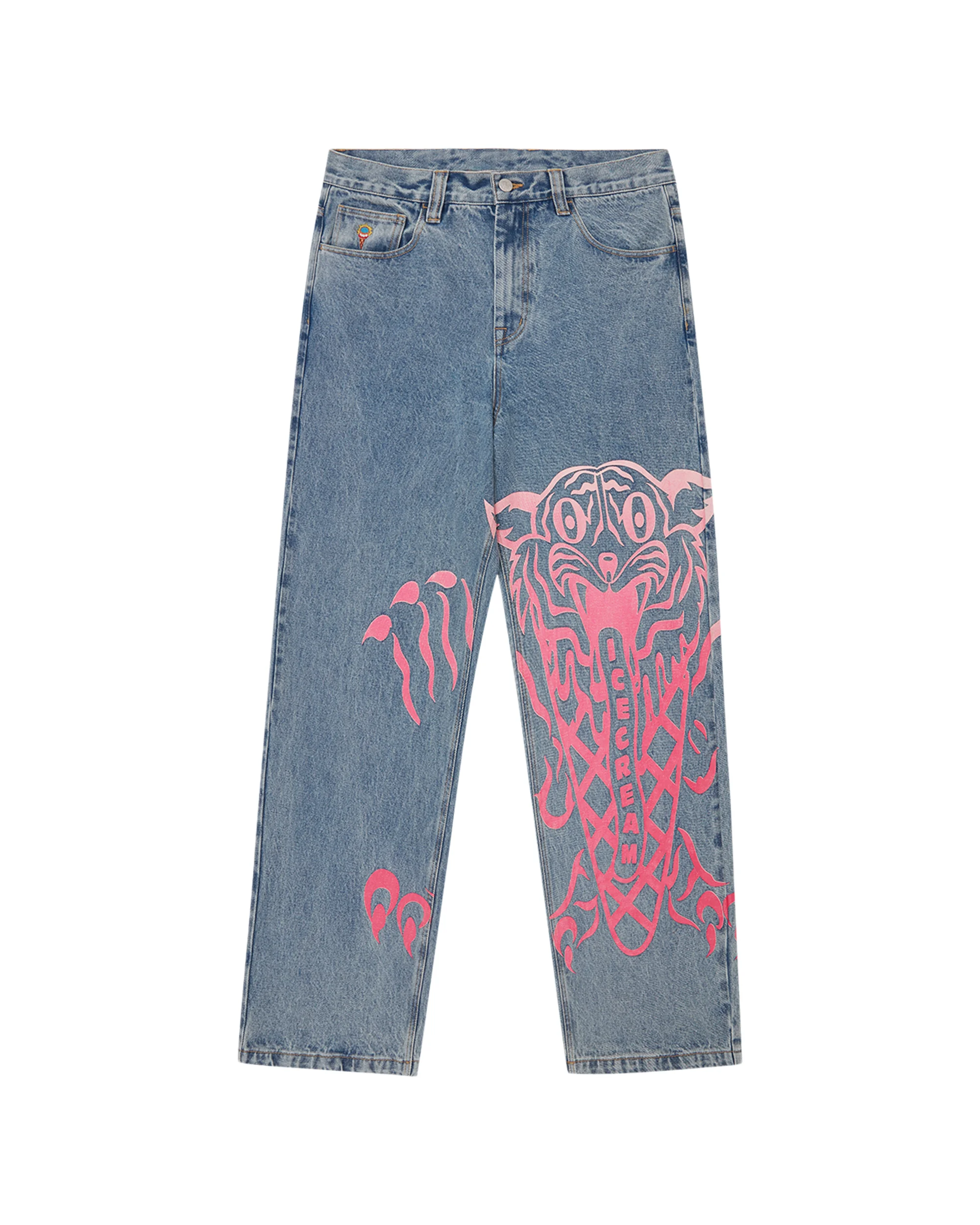 Tiger Triple Scoop Denim Pants featuring bold Icecream graphics on the front and back. The front showcases an oversized pink Running Dog graphic down the leg, the back keeps it classic with signature pocket drip stitching. - Light Wash Blue - Baggy fit - Screen print graphic at front and back - Drip embroidery on back pockets - Embroidered cone at coin pocket - Zip-fastened - 100% Cotton