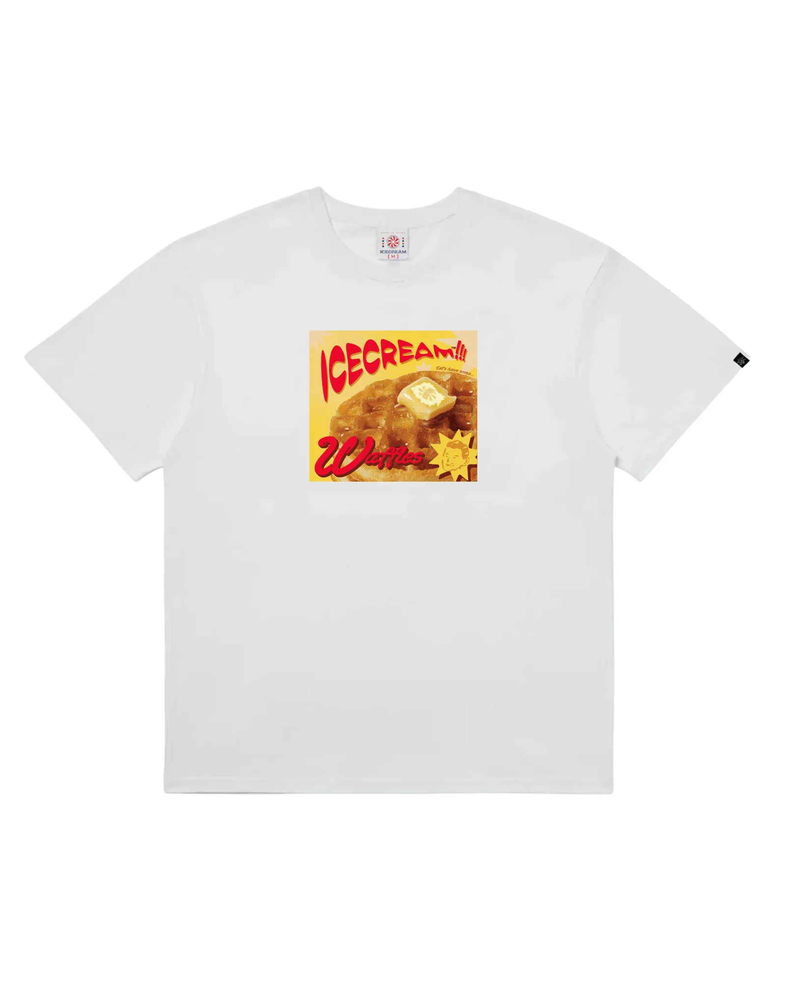 The Waffles! SS Tee features a graphic of the Icecream logo and waffles printed on the front and back. - White - Screen-printed graphics on the front and back - 100% Cotton