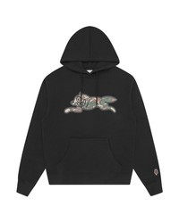 Woodland Camo Running Dog Popover Hood, designed with a Camo pattern screen printed running dog graphic, kangaroo pouch, and drawstring hood. - Black - Regular fit - Camo screen printed Running Dog graphic at chest - Screen print IC signet at back neck - Kangaroo pouch - Hooded - 100% Cotton