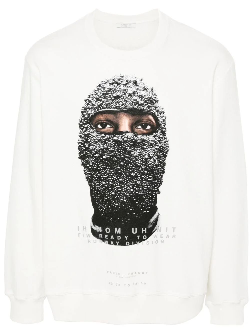 Black Mask sweatshirt Highlights - Off-white - Cotton blend - Jersey texture - Crew neck - Long sleeves - Black mask print to the front - Logo print to the rear - Ribbed cuffs and hem Made in Italy Composition Outer: Cotton 100% Lining: Cotton 95%, Elastane 5% SIZE & FIT Model measurements Height 6 ft 2 in(1.88 m) Bust/Chest 36.61 in(93 cm) Hips 35.82 in(91 cm) Waist 27.95 in(71 cm) FittingInformation Designed for a relaxed fit, this piece allows for comfort and movement when worn The ribbed hem offers a close, comfortable fit Made from a midweight non-stretch fabric, this piece offers minimal elasticity when worn This piece fits true to size – take your usual size