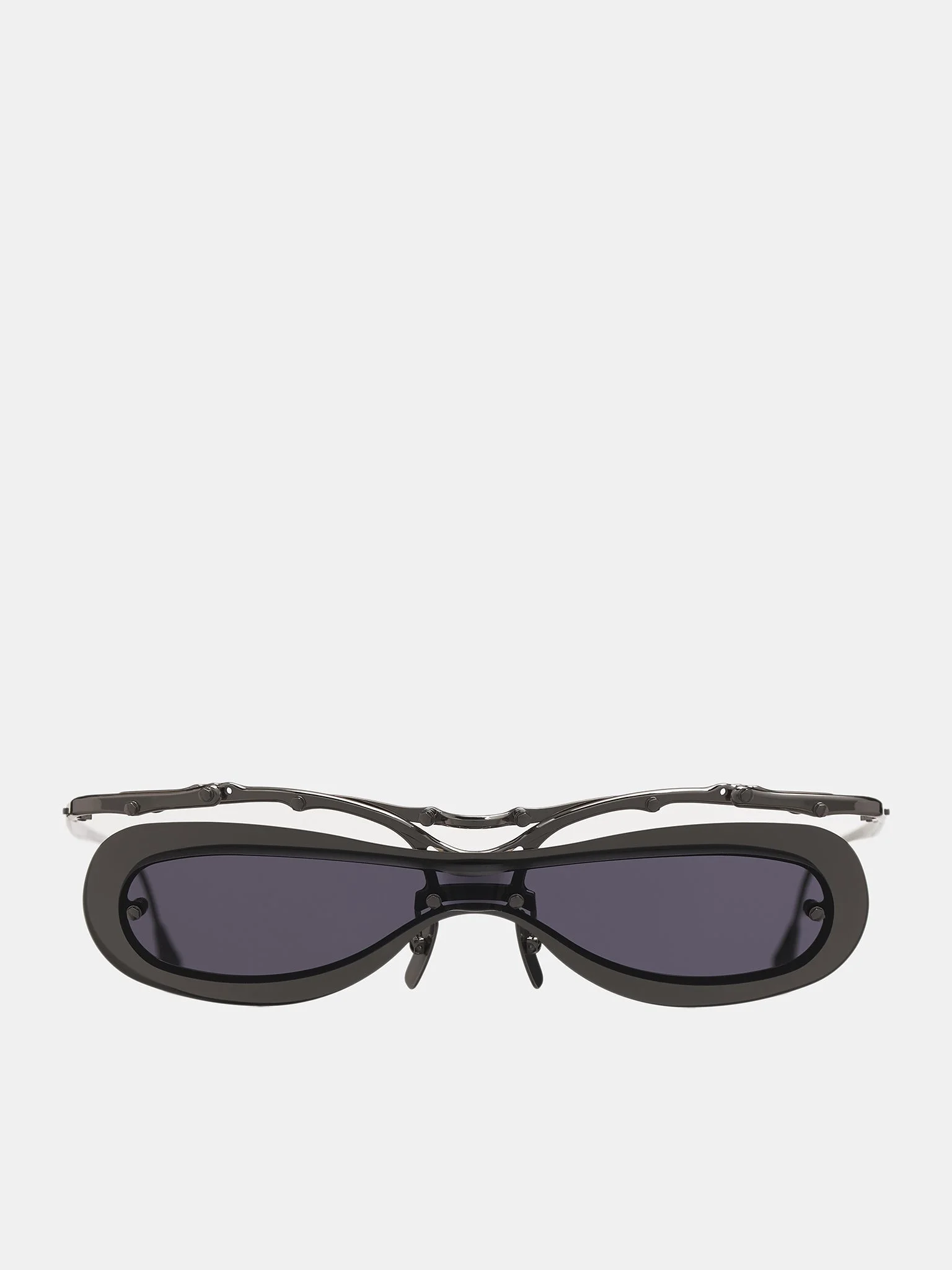 INNERRAUM sunglasses in black & grey, metal construction, double frame design, thick ovular rim frames, rivet embellishment throughout, matte finish, adjustable titanium nose pads, brown-tinted lenses, case included. 100% Metal One Size
