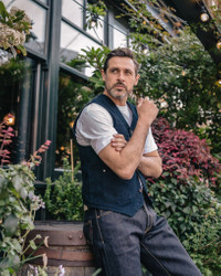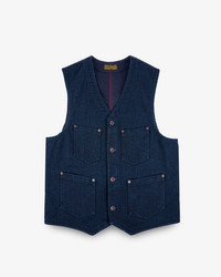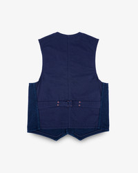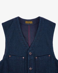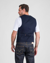 Based on the same pattern as our original IHV-02, this heavyweight vintage-style work vest pairs a 14oz Japanese dobby cloth front with a hardwearing duck canvas back. Woven on a dobby loom using indigo-rope dyed yarns, the geometric weave creates a heavily textured, rugged face with far more exposed edges than a twill or plain weave. To add to the vest’s unique appearance, the yarns are soaked with green sulphur dye at the final stage of dying. This darkens the fabric, creating a distinctive hue which will quickly fade in high-wear areas to emphasise the three-dimensional nature of the dobby weave. Made In Japan - Designed by Shinichi Haraki, handmade by WORKS INC. in Japan 14oz Japanese Sashiko Dobby Cloth - 100% cotton - Dobby loom woven - Indigo rope-dyed warp and weft yarns - To darken the fabric, the yarns are soaked in green sulphur dye at the final dyeing stage - This fabric will fade with contrast in high wear areas, emphasising the heavily textured weave Cut & Construction - Traditional work vest - Two chest pockets - Two waist pockets - Iron Heart branded tack button fastenings - Cotton duck canvas back - Rear buckle cinch - Copper reinforcement rivets - Taped seams throughout to protect fabric edges Model Sizing Model Sam is wearing Large One-Washed - Post construction, we wash the completed garment in an aggressive industrial washing machine. This process removes virtually all potential shrinkage. - No further shrinkage is expected when washed according to our care guidelines Care Guidelines - We recommend washing this garment at 30°C with a low (or no) spin cycle. Hang dry, do not tumble dry