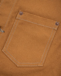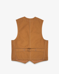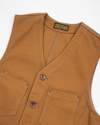 This work vest is constructed from our hardwearing and functional 17oz brown cotton duck canvas. Easily layered over a t-shirt in the spring or under a jacket in the winter, it’s a solid all year-round piece that's sure to see plenty of evolution the more it is worn. Made In Japan - Designed by Shinichi Haraki, handmade by WORKS INC. in Japan 17oz Japanese Duck Canvas - Brown - 100% cotton - Brown warp and weft - Plain weave - This fabric will slowly fade through wear and washing Features & Construction - Two chest pockets - Two waist pockets - Iron Heart branded tack button fastenings - Cotton duck back - Rear buckle cinch - Copper reinforcement rivets - Felled seams throughout Model Sizing - Model Michael is wearing a Large Sanforized & One-Washed - Sanforization is a post-weave mechanical process which removes most potential shrinkage from a fabric before garment construction - To further reduce the risk of shrinkage, we wash the completed garment in an aggressive industrial washing machine. This process removes virtually all potential shrinkage. - No further shrinkage is expected when washed according to our care guidelines Care Guidelines - We recommend washing this garment at 30°C with a low (or no) spin cycle. Hang dry, do not tumble dry