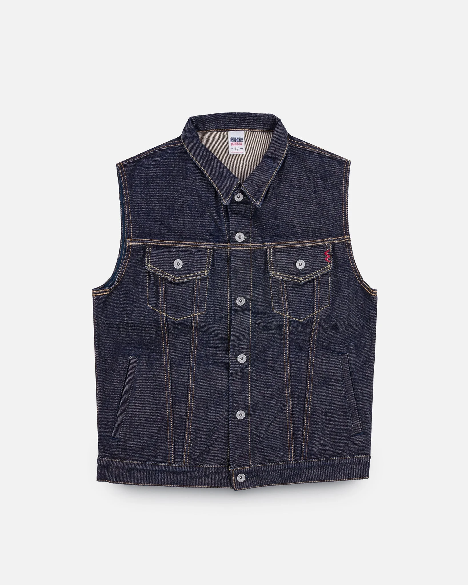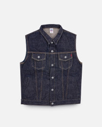 Our "trucker" vest in our super heavy yet super soft 21oz indigo selvedge denim, based on a traditional Type III jacket modified with a slightly longer body and side handwarmer pockets. One of our long-running Iron Heart essentials. Made In Japan - Designed by Shinichi Haraki, handmade by WORKS INC. in Japan Type III Vest - Cut & Features - Modified Type III Vest - Two chest pockets with button-down flaps - Hand warmer pockets, the construction of which creates two internal pockets 21oz Japanese Selvedge Denim - Indigo - The first-ever Iron Heart denim, our signature weave - 100% cotton - Woven with a double twisted weft yarn - Indigo rope-dyed warp / white weft - Right-hand twill weave - This denim will fade naturally through wear and washing Hardware & Construction - Iron Heart branded tack button fastenings - All felled seam construction - Taped arm openings Model Sizing Model Johnny wears Large Sanforized & One-Washed - Sanforization is a post-weave mechanical process which removes most potential shrinkage from a fabric before garment construction - To further reduce the risk of shrinkage, we wash the completed garment in an aggressive industrial washing machine. This process removes virtually all potential shrinkage. - No further shrinkage is expected when washed according to our care guidelines Care Guidelines - We recommend washing this garment at 30°C with a low (or no) spin cycle. Hang dry, do not tumble dry