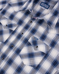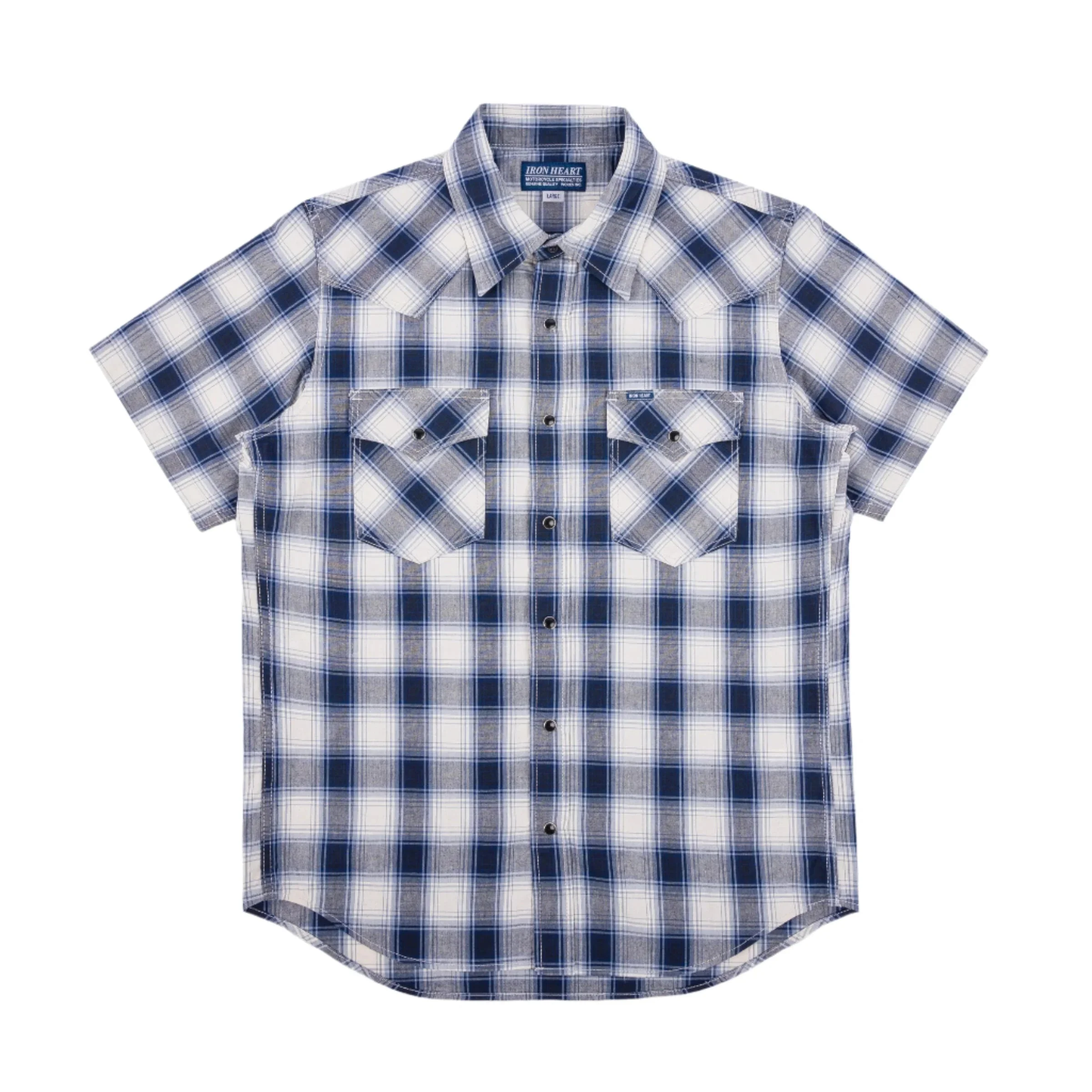 One of the lightest and most breathable fabrics in the Iron Heart lineup, these 5oz selvedge short-sleeve shirts are perfect for pairing with shorts or chinos, even on the hottest summer days. Seen here in their western cut, this shirt offers a slimmer fit compared to the work shirt cut, with snap fastenings and traditional western-style yokes. The classic madras check pattern is woven from 100% cotton, using sulphur-dyed yarns that allow the colours to mellow and mature with wear. - 100% cotton - 5oz Japanese madras check - Reactive dyed yarns will resist fading - Short sleeved western shirt with a slim fit - White stitching and bar tacks - Snap button closures - Dual western style chest pockets - Single, double and triple needle stitch construction - Western back and shoulder yoke - Felled internal seams - Chainstitch runoff - One washed - no shrinkage expected - Made in Japan Size up from your usual size