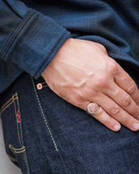 Made by our friends at Faith SFK & Life, this sovereign-style ring is cast from .925 sterling silver and fitted with a custom-made YKK copper button — the same kind used for the snap fastenings on our CPO shirts. Of all our rings, this is Shinichi Haraki’s favourite design — and the one you’re most likely to see adorning the Boss’s finger. Made by Faith SFK & Life Handmade to Shinichi Haraki's design by Faith SFK & Life in Taiwan Style & Features - Sovereign-style ring - .925 sterling silver - Custom-made Iron Heart branded YKK copper button - Internal Iron Heart engraving
