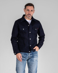 Our classic Type III jacket, modified with a slightly longer than traditional body and with the addition of side handwarmer pockets, made from our 14oz indigo/black selvedge denim (second version which is made with a double twisted weft yarn, the same construction technique as our 21oz selvedge denim). Made In Japan - Designed by Shinichi Haraki, handmade by WORKS INC. in Japan 14oz Japanese Selvedge Denim - Indigo/Black - 100% cotton - Woven with a double twisted weft yarn - Indigo rope-dyed warp / black sulphur-dipped weft - Right-hand twill weave - This denim offers a darker appearance and will fade with high contrast through wear and washing Cut & Features - Inspired by the iconic Levi’s Type III trucker jacket - Slightly longer than traditional body length - Flap-down chest pockets - Handwarmer pockets, the construction of which creates two internal pockets - Dual hem cinches Hardware & Construction - Iron Heart branded tack button fastenings - Poly/cotton stitching - Single and double needle chainstitch construction - Internal felled seams Model Sizing Model Sam is wearing Large Sanforized & One-Washed - Sanforization is a post-weave mechanical process which removes most potential shrinkage from a fabric before garment construction - To further reduce the risk of shrinkage, we wash the completed garment in an aggressive industrial washing machine. This process removes virtually all potential shrinkage. - No further shrinkage is expected when washed according to our care guidelines Care Guidelines - We recommend washing this garment at 30°C with a low (or no) spin cycle. Hang dry, do not tumble dry