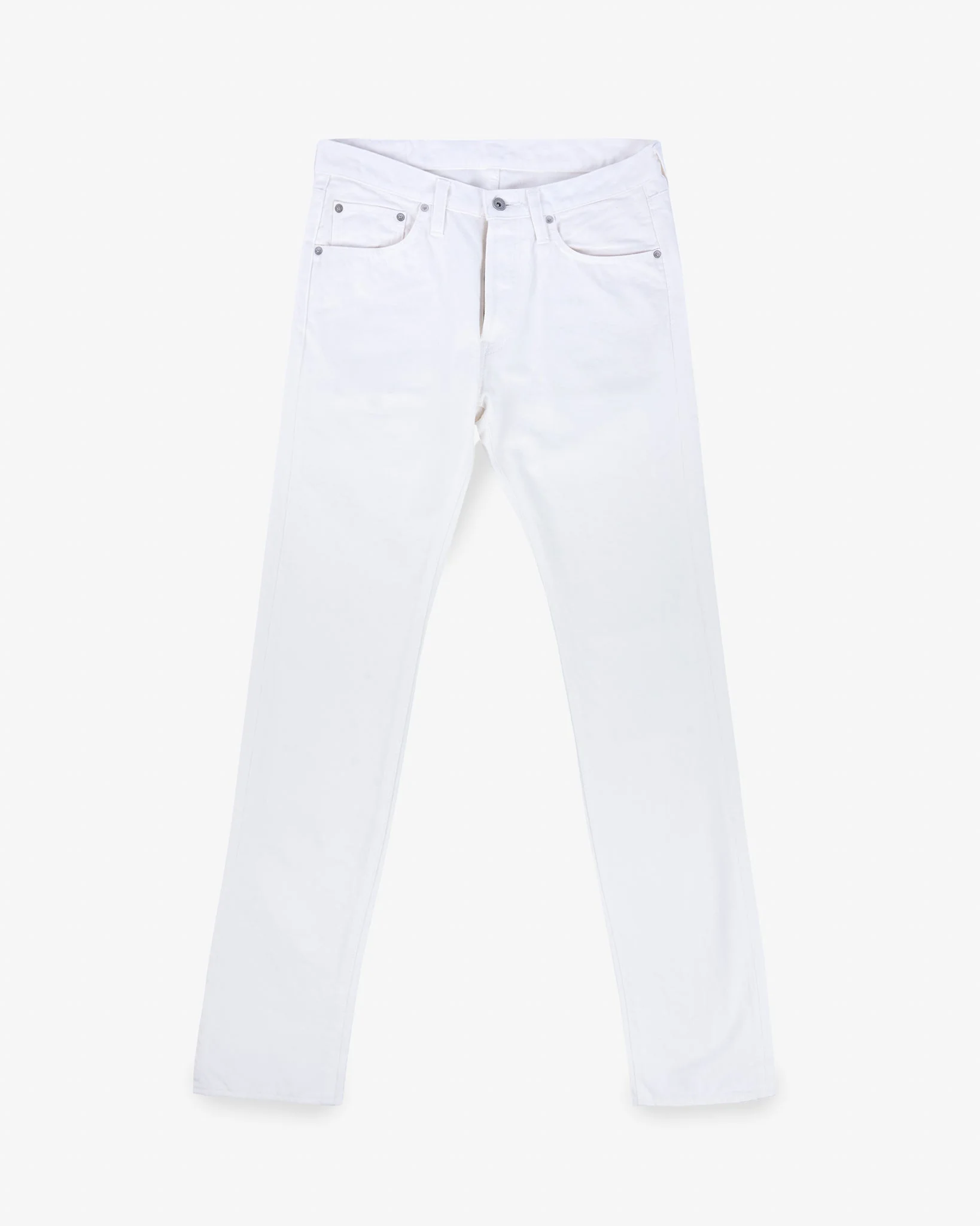 Our slim cut, medium/high rise jeans, constructed from 13.5oz white denim, woven with open-ended yarns to create an authentic '70s/80s style fabric. Along with our usual over-engineered features such as lined pockets and reinforced belt loops, to complement the pure white weave we’ve added aluminium rivets and tonal fabric rear patch - all adding up to create a hardwearing pair of jeans with a very clean appearance. Made In Japan - Designed by Shinichi Haraki, handmade by WORKS INC. in Japan 555 Slim Cut - The slimmest fitting jeans cut in the Iron Heart lineup - Medium/high rise - Slim fit leg profile - Classic 5-pocket design 13.5oz Japanese Non-Selvedge Denim - White - 100% cotton - Woven with open-ended yarns - Non-selvedge - Pure white bleached warp and weft yarns - Right-hand twill weave Hardware & Construction - Traditional 3-button fly - Iron Heart branded tack button at waistband - Works Inc branded pocket rivets - Hidden rivets on rear pockets - Poly/cotton stitching for increased strength - Single and double needle chain stitch construction - Belt loops anchored at three points and sewn into the waistband - Heavy cotton pocket bags and lined rear pockets Sanforized & One-Washed - Sanforization is a post-weave mechanical process which removes most potential shrinkage from a fabric before garment construction - To further reduce the risk of shrinkage, we wash the completed garment in an aggressive industrial washing machine. This process removes virtually all potential shrinkage. - No further shrinkage is expected when washed according to our care guidelines Stretch Details - The waist will stretch out approximately 1" with wear. All other dimensions that are put under pressure will stretch proportionally to the waist Care Guidelines - We recommend washing this garment at 30°C with a low (or no) spin cycle. Hang dry, do not tumble dry