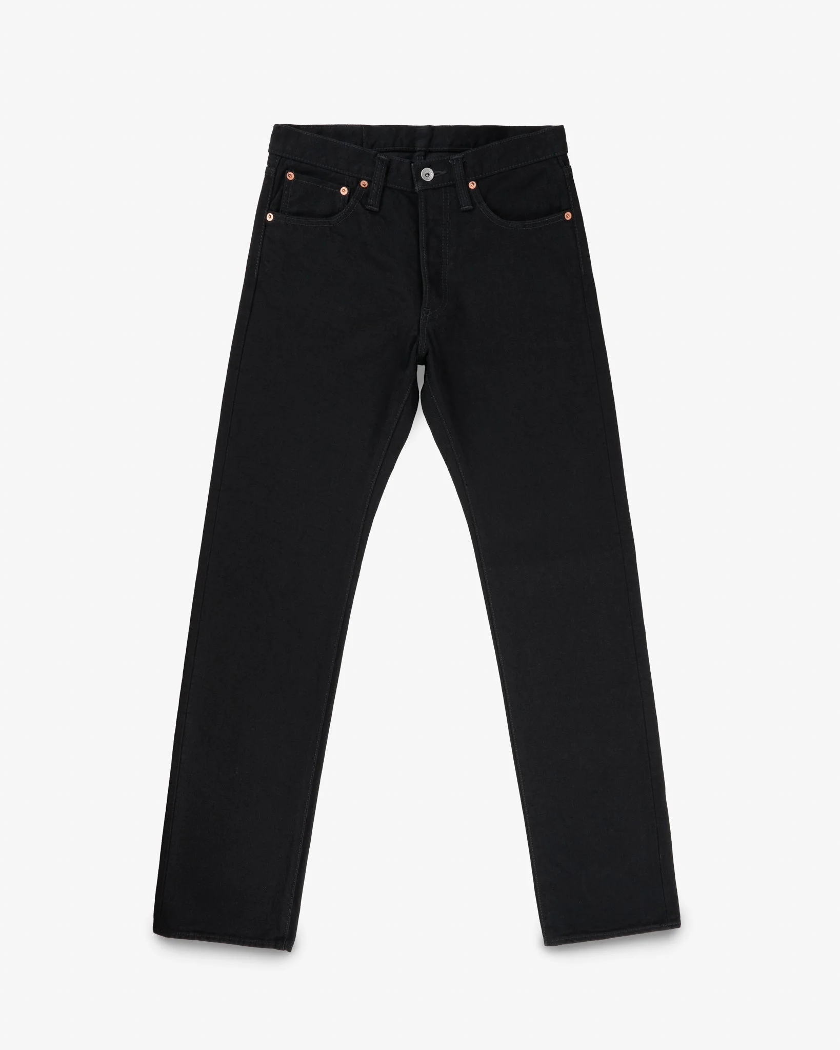 Our traditional straight jean cut in 14oz black selvedge denim. Unlike reactive-dyed "Superblack" denim, this fabric is woven with a black sulphur rope-dyed warp yarn and a black sulphur-dipped weft. Finished with tonal stitching, expect these jeans to gradually fade to grey with wear and washing. Made In Japan - Designed by Shinichi Haraki, handmade by WORKS INC. in Japan 634 Straight Cut - Traditional straight cut, inspired by the 1966 Levi’s 501 - Medium Rise - Straight leg profile with a slight taper from knee to hem - Wider leg opening to accommodate most types of boots and footwear - Classic 5-pocket design 14oz Japanese Selvedge Denim - Black - 100% cotton - Woven with a double twisted weft yarn - Black sulphur-dyed warp and weft - Right-hand twill weave - This denim will gradually fade to grey through wear and washing Hardware & Construction - Traditional 3-button fly - Iron Heart branded tack button at waistband - Works Inc branded pocket rivets - Hidden rivets on rear pockets - Poly/cotton stitching for increased strength - Single and double needle chain stitch construction - Belt loops anchored at three points and sewn into the waistband - Heavy cotton pocket bags and lined rear pockets Selvedge ID - Sideseam, fly, and coin pocket selvedge ID Leather Patch - Lightweight vegetable-tanned steerhide - Stitched on all sides - Dyed Iron Heart graphic - Please note: Continued washing (especially at higher temperatures) may cause shrinkage and deformities Sanforized & One-Washed - Sanforization is a post-weave mechanical process which removes most potential shrinkage from a fabric before garment construction - To further reduce the risk of shrinkage, we wash the completed garment in an aggressive industrial washing machine. This process removes virtually all potential shrinkage. - No further shrinkage is expected when washed according to our care guidelines Stretch Details - The waist will stretch out approximately 1" with wear. All other dimensions that are put under pressure will stretch proportionally to the waist Care Guidelines - We recommend washing this garment at 30°C with a low (or no) spin cycle. Hang dry, do not tumble dry