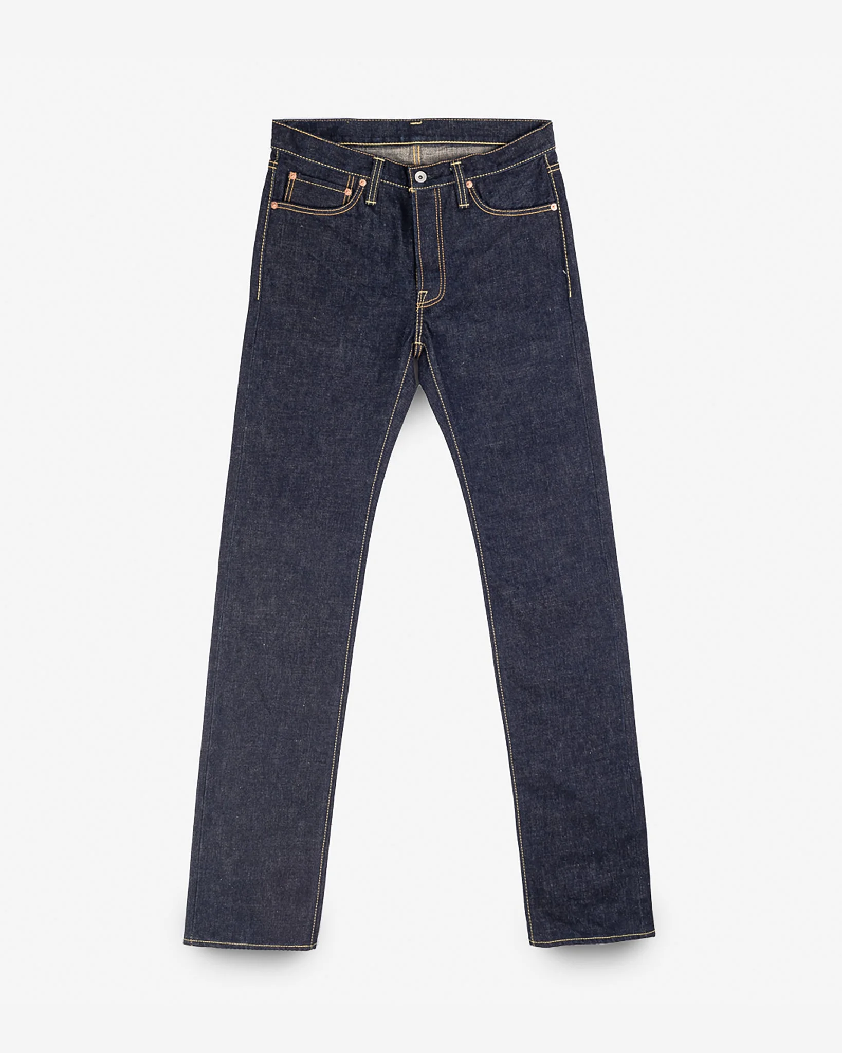 Our slim straight cut "Devil's Fit" jean in 18oz indigo selvedge denim, woven for us in the renowned Shinya mill which is famed for authentically vintage style denims, whilst the jeans are constructed to Iron Heart's high technical standards. Mixing old methods and new techniques is Iron Heart's "vintage style". Made In Japan - Designed by Shinichi Haraki, handmade by WORKS INC. in Japan 666 Slim Straight Cut - Traditional straight cut styling with an all-around slimmer profile - Medium/low rise - Straight leg profile with a slight taper from knee to hem - Classic 5-pocket design 18oz Japanese Vintage Selvedge Denim - 100% cotton - Indigo rope-dyed warp / white weft - Right-hand twill weave - This vintage-style denim will fade naturally through wear and washing Hardware & Construction - Traditional 3-button fly - Iron Heart branded tack button at waistband - Works Inc branded pocket rivets - Hidden rivets on rear pockets - Poly/cotton stitching for increased strength - Single and double needle chain stitch construction - Belt loops anchored at three points and sewn into the waistband - Heavy cotton pocket bags and lined rear pockets Selvedge ID - Sideseam, fly, and coin pocket selvedge ID Leather Patch - Heavyweight vegetable-tanned steerhide - Natural finish - Belt-through design - Debossed Iron Heart graphic - Please note: Continued washing (especially at higher temperatures) may cause shrinkage and deformities Sanforized & One-Washed - Sanforization is a post-weave mechanical process which removes most potential shrinkage from a fabric before garment construction - To further reduce the risk of shrinkage, we wash the completed garment in an aggressive industrial washing machine. This process removes virtually all potential shrinkage. - No further shrinkage is expected when washed according to our care guidelines Stretch Details - The waist will stretch out approximately 1" with wear. All other dimensions that are put under pressure will stretch proportionally to the waist Care Guidelines - We recommend washing this garment at 30°C with a low (or no) spin cycle. Hang dry, do not tumble dry