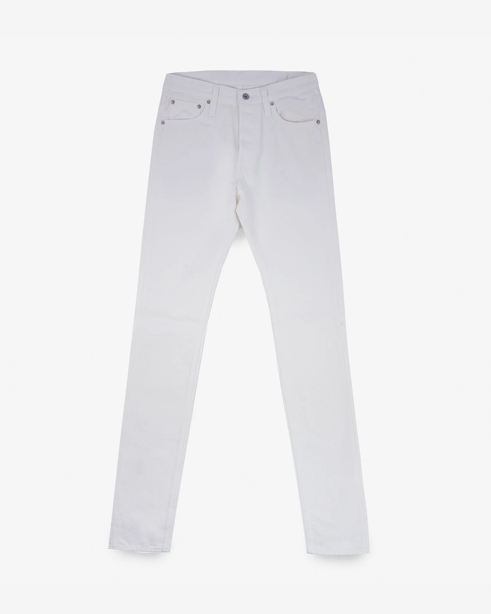 Our slim tapered cut, low rise jeans, constructed from 13.5oz white denim, woven with open-ended yarns to create an authentic '70s/80s style fabric. Along with our usual over-engineered features such as lined pockets and reinforced belt loops, to complement the pure white weave we’ve added aluminium rivets and tonal fabric rear patch - all adding up to create a hardwearing pair of jeans with a very clean appearance. Made In Japan - Designed by Shinichi Haraki, handmade by WORKS INC. in Japan 777 Slim Tapered Cut - Slim fit for those who prefer their jeans to sit lower on the hips - Low rise - Slim fit with a pronounced tapered from knee to hem - Classic 5-pocket design 13.5oz Japanese Non-Selvedge Denim - White - 100% cotton - Woven with open-ended yarns - Non-selvedge - Pure white bleached warp and weft yarns - Right-hand twill weave Hardware & Construction - Traditional 3-button fly - Iron Heart branded tack button at waistband - Works Inc branded pocket rivets - Hidden rivets on rear pockets - Poly/cotton stitching for increased strength - Single and double needle chain stitch construction - Belt loops anchored at three points and sewn into the waistband - Heavy cotton pocket bags and lined rear pockets Sanforized & One-Washed - Sanforization is a post-weave mechanical process which removes most potential shrinkage from a fabric before garment construction - To further reduce the risk of shrinkage, we wash the completed garment in an aggressive industrial washing machine. This process removes virtually all potential shrinkage. - No further shrinkage is expected when washed according to our care guidelines Stretch Details - The waist will stretch out approximately 1" with wear. All other dimensions that are put under pressure will stretch proportionally to the waist Care Guidelines - We recommend washing this garment at 30°C with a low (or no) spin cycle. Hang dry, do not tumble dry