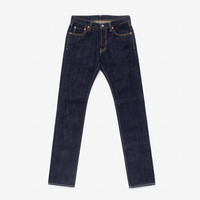 Our slim tapered cut jean in 17oz natural indigo/organic cotton selvedge denim. This denim is very reluctant to give up its very deep indigo, so it takes a long time to fade, but when it does it fades with great contrast. Details - Made in Japan - Slim tapered cut - Low rise - 17oz rope dyed natural indigo warp, natural weft Japanese selvedge denim - Organic cotton - Beige weft - Button fly - Belt loops sewn into waist band - Unlined rear pockets - Selvedge side seams and fly construction - Poly/cotton constructional stitching - Sanforized and one-washed - little to no shrinkage to be expected - The waist will stretch out approximately one inch with wear - Other dimensions will stretch proportionately to the waist - Model Sam wears tag 32, Steve wears tag 33 - Worn with The Bootery/Wesco® Foot Patrol - Need a shorter length? You will be prompted on checkout to order hemming if required