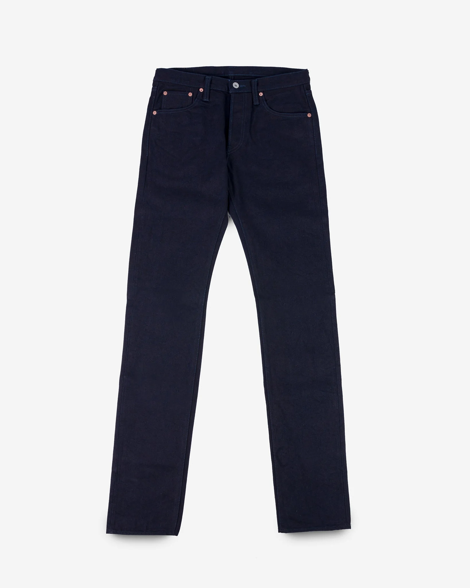 Our slim tapered cut jeans, made from 14oz selvedge denim where both the warp and the weft (which is usually undyed) have been rope dyed indigo. Constructed with navy tonal stitching. Made In Japan - Designed by Shinichi Haraki, handmade by WORKS INC. in Japan 777 Slim Tapered Cut - Slim fit for those who prefer their jeans to sit lower on the hips - Low rise - Slim fit with a pronounced tapered from knee to hem - Classic 5-pocket design 14oz Japanese Selvedge Denim - Indigo/Indigo - 100% cotton - Woven with a double twisted weft yarn - Indigo roped dyed warp and weft - Right-hand twill weave - This denim offers an intense indigo appearance which will fade with high contrast through wear and washing Hardware & Construction - Traditional 3-button fly - Iron Heart branded tack button at waistband - Works Inc branded pocket rivets - Hidden rivets on rear pockets - Poly/cotton stitching for increased strength - Single and double needle chain stitch construction - Belt loops anchored at three points and sewn into the waistband - Heavy cotton pocket bags and lined rear pockets Selvedge ID - Sideseam, fly, and coin pocket selvedge ID Leather Patch - Lightweight vegetable-tanned steerhide - Stitched on all sides - Dyed Iron Heart graphic - Please note: Continued washing (especially at higher temperatures) may cause shrinkage and deformities Sanforized & One-Washed - Sanforization is a post-weave mechanical process which removes most potential shrinkage from a fabric before garment construction - To further reduce the risk of shrinkage, we wash the completed garment in an aggressive industrial washing machine. This process removes virtually all potential shrinkage. - No further shrinkage is expected when washed according to our care guidelines Stretch Details - The waist will stretch out approximately 1" with wear. All other dimensions that are put under pressure will stretch proportionally to the waist Care Guidelines - We recommend washing this garment at 30°C with a low (or no) spin cycle. Hang dry, do not tumble dry