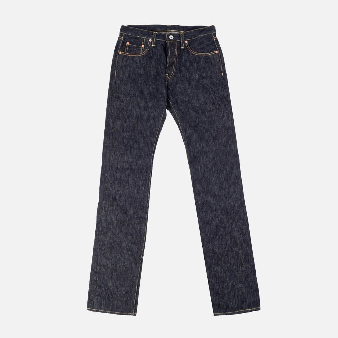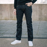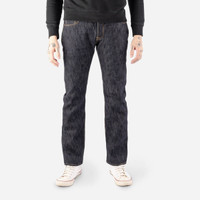 A first for Iron Heart, a slubby denim. This deep indigo selvedge denim has a really uneven hand on both the face and reverse (think off the scale loom-chatter), but at the same time, it is incredibly soft and comfortable to wear. Details - Made in Japan - Slim Tapered Cut - Low rise - 16oz Japanese 'slubby' selvedge denim - Lined rear pockets - Button fly and hidden rivets - Belt loops sewn into waist band - Poly/cotton constructional stitching - Selvedge side seams and fly construction - Sanforized and one-washed - little to no shrinkage to be expected - The waist will stretch out approximately one inch with wear - Other dimensions under pressure will stretch proportionately to the waist - Model Johnny wears tag 33 - The nature of this denim is such that there will be irregularities in the denim and substantial leg twist. Please do not buy these if you think that you won’t be able to live with these characteristics