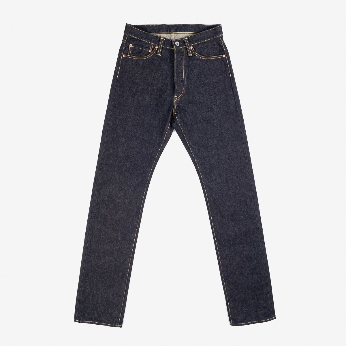 Our high rise relaxed tapered cut jean, made from 14oz indigo selvedge denim. Our 14oz denim (second version) is made with a double twisted weft yarn (the same construction technique as our 21oz selvedge denim) At 14oz, this is our "least heavy" Japanese jean denim. Details - Made in Japan - Relazed tapered cut - Medium/high rise - 14oz denim Japanese selvedge denim - Woven with a double twisted weft yarn (the same as our 21oz selvedge denim) - Lined rear pockets - Button fly and hidden rivets - Belt loops sewn into waist band - Poly/cotton constructional stitching - Selvedge side seams and fly construction - Sanforized and one-washed - little to no shrinkage to be expected - The waist will stretch out approximately one inch with wear - Other dimensions will stretch proportionately to the waist - Model Adam C wears tag 33 - Worn with Iron Heart Int'l x Wesco® 8" Jobmaster - Need a shorter length? You will be prompted on checkout to order hemming if required