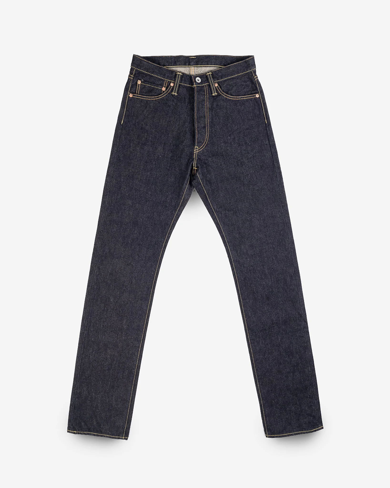 Our relaxed tapered cut jean, made from 14oz indigo selvedge denim. Our 14oz denim (second version) is made with a double twisted weft yarn (the same construction technique as our 21oz selvedge denim) At 14oz, this is our "least heavy" Japanese jean denim. Made In Japan - Designed by Shinichi Haraki, handmade by WORKS INC. in Japan 888 Relaxed Tapered Cut - Modern tapered styling with a more relaxed fit - Medium/high rise - Roomier fit in the top block and thighs - Pronounced taper from knee to hem - Classic 5-pocket design 14oz Japanese Selvedge Denim - 100% cotton - Woven with a double twisted weft yarn - Indigo rope-dyed warp / white weft - Right-hand twill weave - This denim will fade naturally through wear and washing Hardware & Construction - 4-button fly (extra button added due to the higher rise) - Iron Heart branded tack button at waistband - Works Inc branded pocket rivets - Hidden rivets on rear pockets - Poly/cotton stitching for increased strength - Single and double needle chain stitch construction - Belt loops anchored at three points and sewn into the waistband - Heavy cotton pocket bags and lined rear pockets Selvedge ID - Sideseam, fly, and coin pocket selvedge ID Leather Patch - Lightweight vegetable-tanned steerhide - Stitched on all sides - Dyed Iron Heart graphic - Please note: Continued washing (especially at higher temperatures) may cause shrinkage and deformities Sanforized & One-Washed - Sanforization is a post-weave mechanical process which removes most potential shrinkage from a fabric before garment construction - To further reduce the risk of shrinkage, we wash the completed garment in an aggressive industrial washing machine. This process removes virtually all potential shrinkage. - No further shrinkage is expected when washed according to our care guidelines Stretch Details - The waist will stretch out approximately 1" with wear. All other dimensions that are put under pressure will stretch proportionally to the waist Care Guidelines - We recommend washing this garment at 30°C with a low (or no) spin cycle. Hang dry, do not tumble dry