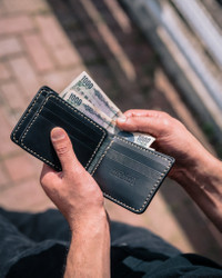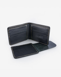 Beautifully soft calfskin leather folding wallet, constructed with hand-sewn goat Achilles tendon. Featuring ten credit card slots, removable centre credit card leaf, and a large bank note section. Finished with debossed Iron Heart Motorcycle Specialties branding. Made In Japan - Designed by Shinichi Haraki, handmade by WORKS INC. in Japan Calf Folding Wallet - Black - Calfskin - Calfskin is a premium leather made from the hide of young cattle. It’s known for its fine grain, smooth texture, and soft feel, while still offering good durability. Compared to full-grown cowhide, calfskin is thinner and more supple, developing a subtle patina over time - Because of its smooth finish, calfskin can be prone to scuffs — so take care around rough surfaces, and buff lightly with a soft cloth to reduce minor marks. - To keep calfskin in top condition, apply a small amount of leather conditioner when the leather begins to feel dry or dull — typically every few months, depending on use. Always test in an inconspicuous area first, as calfskin can darken slightly with conditioning. - Clean gently with a soft, dry cloth. For light dirt, use a slightly damp cloth with a mild soap, but avoid excessive moisture. If it does get wet, blot the leather dry with a cloth and leave to air dry naturally — never dry with a heater or hairdryer