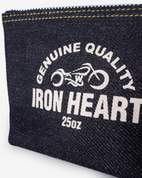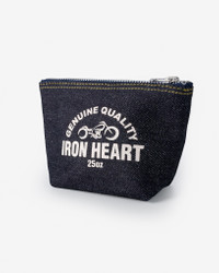 Constructed from our heavyweight 25oz selvedge denim, this handy pouch is the perfect size for storing small accessories and valuables such as keys, glasses and passports. With features including a YKK zipper closure and a classic Iron Heart print, the indigo rope dyed denim will fade and wear over time - just like your favourite pair of jeans. Made In Japan - Designed by Shinichi Haraki, handmade by WORKS INC. in Japan 25oz Selvedge Denim Zip-Up Pouch - 25oz Japanese selvedge denim - Indigo rope dyed warp / Natural weft - will fade with wear - YKK zipper - Single and double needle stitch construction - Height: 10.5cm - Top width: 17cm - Bottom width: 11.5cm - Depth: 6cm Sanforized but Unwashed - Sanforization is a post-weave mechanical process which removes most potential shrinkage from a fabric before garment construction - However, unlike most of our jeans, we have not washed the completed garment in an industrial washing machine, so some shrinkage remains - When washed following our care guidelines, expect approximately 1" shrinkage in the waist and inseam. All other dimensions will shrink proportionately to the waist Care Guidelines - We recommend washing this garment at 30°C with a low (or no) spin cycle. Hang dry, do not tumble dry