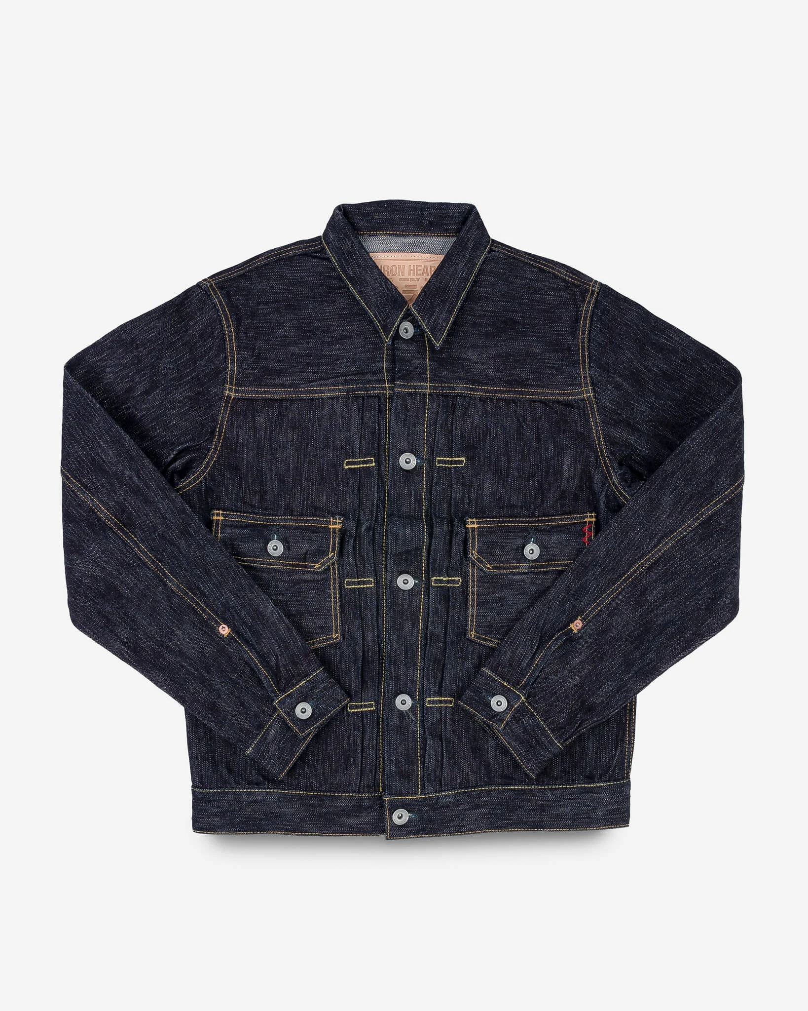 Our interpretation of the “Type II” jacket, inspired by the classic Levi's design from 1953. Slightly longer in the body and less boxy than the original Type II, this Iron Heart version is constructed from our 16oz slubby selvedge denim. This deep indigo selvedge denim has a really uneven hand on both the face and the reverse (think off-the-scale loom-chatter), but at the same time, it is incredibly soft and comfortable to wear. Made In Japan - Designed by Shinichi Haraki, handmade by WORKS INC. in Japan 16oz Japanese Slubby Selvedge Denim - 100% cotton - Loosely woven to create a heavily textured, breathable denim - Indigo rope-dyed warp / white organic cotton weft - Right-hand twill weave - This slub denim will fade with a distinctive grainy characteristic through wear and washing Cut & Features - Inspired by the original Levi’s Type II trucker jacket - Knife pleats on either side of the placket - Mid-breast flap-down pockets - Dual hem cinches Hardware & Construction - Iron Heart branded tack button fastenings - Brass reinforcement rivets - Bias binding taped seams on arm openings - Poly/cotton stitching - Single and double needle chainstitch construction - Internal felled seams Model Sizing Model Sam is wearing Large Sanforized & One-Washed - Sanforization is a post-weave mechanical process which removes most potential shrinkage from a fabric before garment construction - To further reduce the risk of shrinkage, we wash the completed garment in an aggressive industrial washing machine. This process removes virtually all potential shrinkage. - No further shrinkage is expected when washed according to our care guidelines Care Guidelines - We recommend washing this garment at 30°C with a low (or no) spin cycle. Hang dry, do not tumble dry