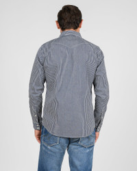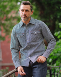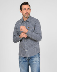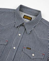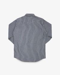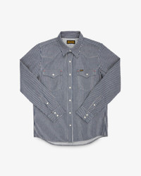 Released in 2009, the 7th Iron Heart shirt designed by Haraki san and now the longest in continuous production. Our classic western shirt in 12oz sulphur dyed hickory stripe cotton twill, construction includes double and triple chainstitch and - being sulphur dyed - the fabric will fade. Made In Japan - Designed by Shinichi Haraki, handmade by WORKS INC. in Japan 12oz Japanese Hickory Stripe - 100% cotton - Twill weave - Indigo sulphur-dyed warp / white weft - This fabric will fade with vintage character through wear and washing Cut & Features - Western shirt - Slim fit - Snap fastenings - Flap down chest pockets - Western-style front and back yokes - Curved hem Constructional Stitching - Single, double and triple needle stitching - Poly/cotton thread for enhanced strength and durability - Bar tack pocket reinforcements - Chainstitched side seams - Felled internal seams Optional Upgrades This garment is fitted with Iron Heart branded Permex snap fastenings. Want to customise? Upgrade with a choice of alternative 'heavyweight' snap options when you add to cart Model Sizing Model Sam is wearing Large One-Washed - Post construction, we wash the completed garment in an aggressive industrial washing machine. This process removes virtually all potential shrinkage. - No further shrinkage is expected when washed according to our care guidelines Care Guidelines - We recommend washing this garment at 30°C with a low (or no) spin cycle. Hang dry, do not tumble dry