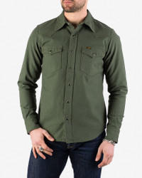 Our classic western cut shirt in a 13oz sulphur-dyed olive drab green military grade heavy cotton serge, with black snaps, and made with our usual fantastic attention to detail. Being sulphur-dyed, this fabric will fade over time. Made In Japan - Designed by Shinichi Haraki, handmade by WORKS INC. in Japan 13oz Japanese Military Serge - 100% cotton - Serge twill weave - Sulphur-dyed warp and weft yarns - This fabric will fade with vintage character through wear and washing Cut & Features - Western shirt - Slim fit - Snap fastenings - Flap down chest pockets - Western-style front and back yokes - Curved hem Optional Upgrades This garment is fitted with Iron Heart branded Permex snap fastenings. Want to customise? Upgrade with a choice of alternative 'heavyweight' snap options when you add to cart Constructional Stitching - Single and double needle stitching - Poly/cotton thread for enhanced strength - Bar tack pocket reinforcements - Chainstitched side seams - Felled internal seams Model Sizing Model Olly wears Large One-Washed - Post construction, we wash the completed garment in an aggressive industrial washing machine. This process removes virtually all potential shrinkage. - No further shrinkage is expected when washed according to our care guidelines Care Guidelines - We recommend washing this garment at 30°C with a low (or no) spin cycle. Hang dry, do not tumble dry