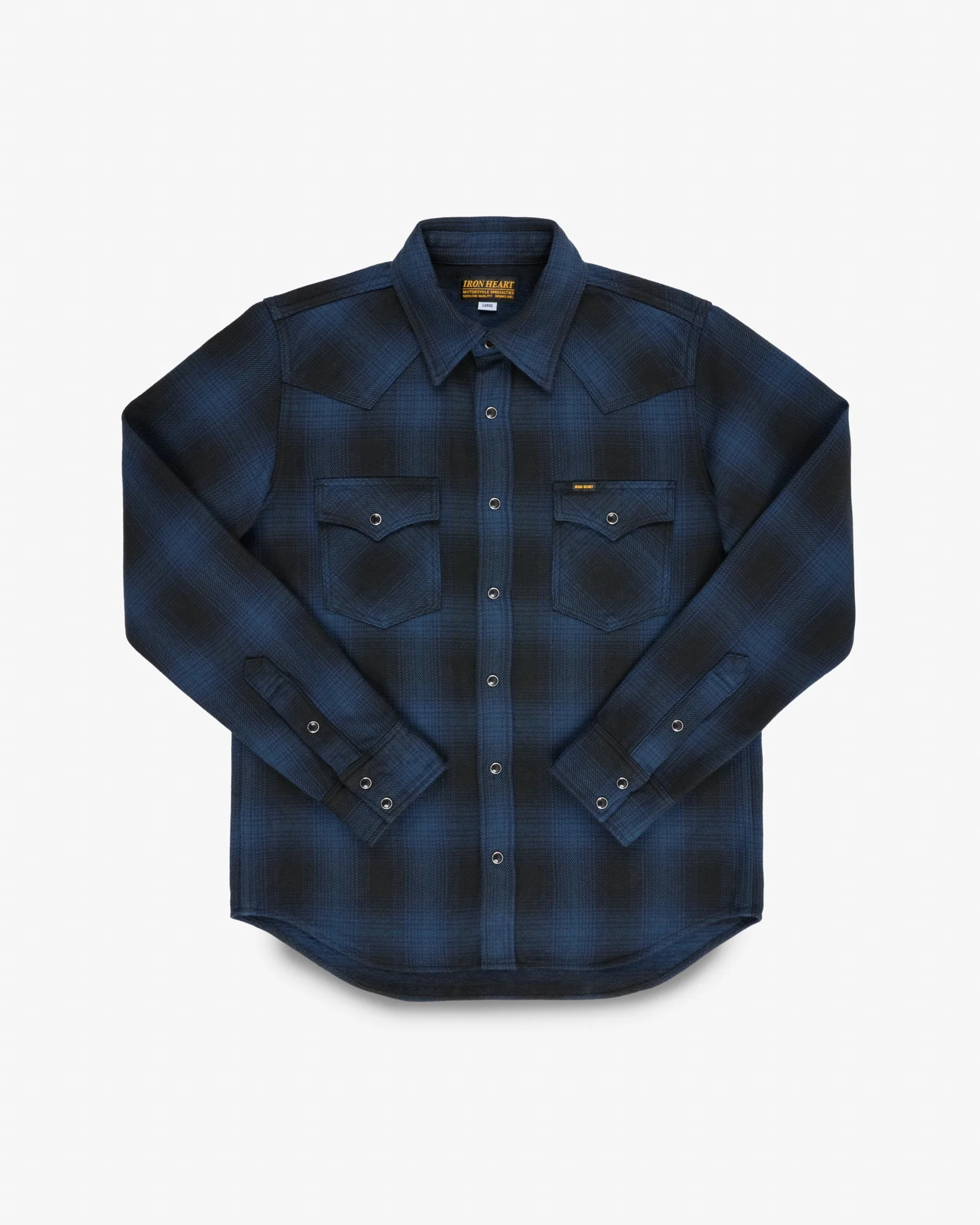 To a great extent, our ultra heavy flannel (UHF) shirts define Iron Heart: heavy, rugged, but amazingly wearable. The 12oz fabric is woven with Aspero cotton from the foothills of the Andes mountains. We double brush it on the inside and single brush it on the outside, resulting in a very soft yet substantial, thick, warm and windproof flannel. This shirt is a wardrobe staple - seen here in a western cut in navy/black ombre check. Made In Japan - Designed by Shinichi Haraki, handmade by WORKS INC. in Japan 12oz Japanese Ultra Heavy Flannel - 100% aspero cotton - Single brushed face / double brushed reverse - Twill weave - Reactive-dyed warp and weft - Fade-resistant to ensure a steadfast colour Cut & Features - Western shirt - Slim fit - Snap fastenings - Flap down chest pockets - Western-style front and back yokes - Curved hem Optional Upgrades This garment is fitted with Iron Heart branded Permex snap fastenings. Want to customise? Upgrade with a choice of alternative 'heavyweight' snap options when you add to cart Constructional Stitching - Single, double and triple needle stitching - Poly/cotton thread for enhanced strength and durability - Bar tack pocket reinforcements - Chainstitched side seams - Felled internal seams Model Sizing Model Sam is wearing Large One-Washed - Post construction, we wash the completed garment in an aggressive industrial washing machine. This process removes virtually all potential shrinkage. - No further shrinkage is expected when washed according to our care guidelines Care Guidelines - We recommend washing this garment at 30°C with a low (or no) spin cycle. Hang dry, do not tumble dry