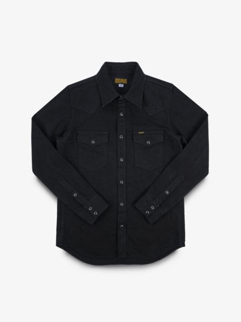Our classic work shirt cut in our 12oz black selvedge denim, the same fabric we use on our much loved "Johnny Cash" western shirt. The denim has both a reactively dyed warp and weft meaning that the shirt will retain its stealth look through wear and washing. Finished with our black permex snaps for secure closure. Made In Japan - Designed by Shinichi Haraki, handmade by WORKS INC. in Japan 12oz Japanese Selvedge Denim - Superblack - 100% cotton - Black reactive-dyed warp and weft - Right-hand twill weave - This denim will experience minimal colour loss Cut & Features - Work shirt - Regular fit - Snap fastenings - Chest pockets with pen holder - Straight back yoke - Rounded hem with gussets and chainstitch run-off Optional Upgrades This garment is fitted with heavy-duty Permex snap fastenings. Want to customise? Upgrade with a choice of Iron Heart branded 'heavyweight' snap options when you add to cart Constructional Stitching - Single and double needle stitching - Poly/cotton thread for enhanced strength - Bar tack pocket reinforcements - Chainstitched side seams - Felled internal seams Selvedge ID - Placket, cuffs and gusset selvedge ID Model Sizing Model Rudi wears Large Sanforized & One-Washed - Sanforization is a post-weave mechanical process which removes most potential shrinkage from a fabric before garment construction - To further reduce the risk of shrinkage, we wash the completed garment in an aggressive industrial washing machine. This process removes virtually all potential shrinkage. - No further shrinkage is expected when washed according to our care guidelines Care Guidelines - We recommend washing this garment at 30°C with a low (or no) spin cycle. Hang dry, do not tumble dry