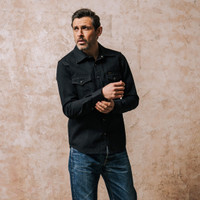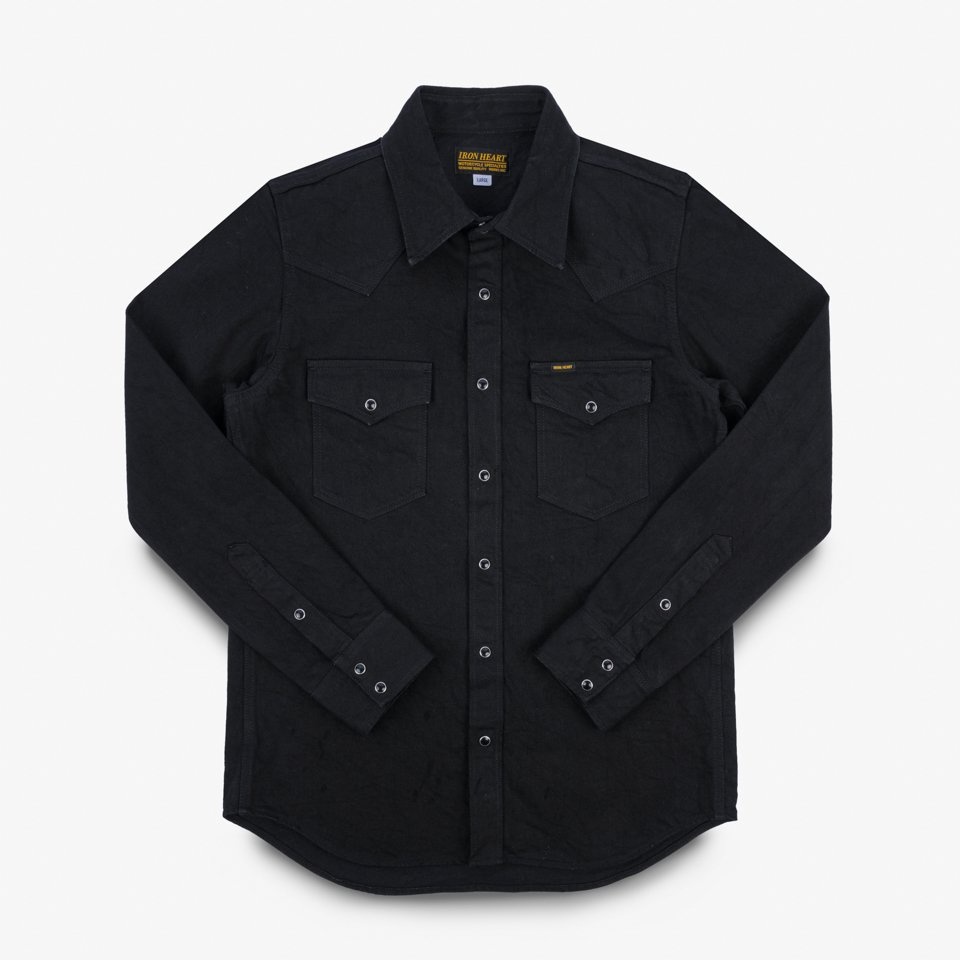 Our classic western shirt, constructed from 13.5oz Japanese non-selvedge denim. This particular denim is woven using open-ended yarns - creating an authentic '70s/80s style fabric - and sulphur dyed to allow for vintage fading to develop through wear and washing. Finished with heavy-duty black snap fastenings and tonal stitching. Details - Made in Japan - Western shirt - 100% cotton - 13.5oz non-selvedge Japanese denim - Sulphur dyed warp and weft - will fade with wear and washing - Tonal stitching - Black Iron Heart logo’d Permex snaps (which can be pimped with a choice of three alternative ‘heavy-duty’ snaps) - Western-style flap patch pockets with snap fastenings - Single, double and triple needle stitch construction - Western-style front and back yokes - Felled internal seams - Red bobbin thread - One washed - no shrinkage expected - Models Johnny and Sam B wear Large - To see what sizes the crew wear, click here