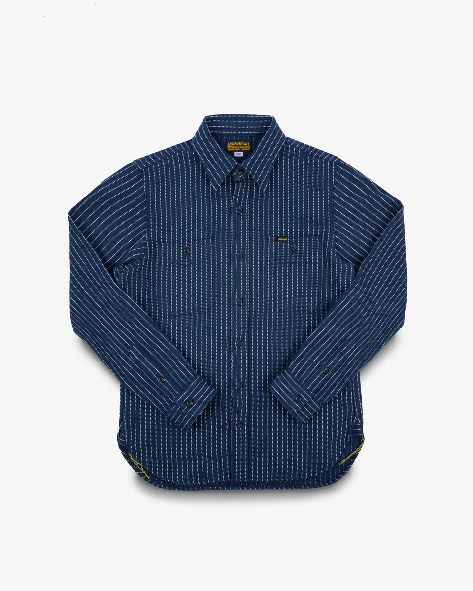 To a great extent, our ultra heavy flannel (UHF) shirts define Iron Heart: heavy, rugged, but amazingly wearable. The 12oz fabric is woven with Aspero cotton from the foothills of the Andes mountains. We double brush it on the inside and single brush it on the outside, resulting in a very soft yet substantial, thick, warm and windproof flannel. This shirt is a wardrobe staple - seen here in our work cut in navy with woven wabash-inspired chalk stripes. For FW24, we've upgraded the buttons on this season's flannel work shirts. Instead of the two-hole cat's eye buttons used in previous models, the shirts now feature more robust four-hole buttons for a more secure fastening. Made In Japan - Designed by Shinichi Haraki, handmade by WORKS INC. in Japan 12oz Japanese Ultra Heavy Flannel - 100% aspero cotton - Single brushed face / double brushed reverse - Twill weave - Reactive-dyed warp and weft - Fade-resistant to ensure a steadfast colour Cut & Features - Work shirt - Regular fit - Button fastenings - Chest pockets with pen holder - Straight back yoke - Rounded hem with gussets and chainstitch run-off Optional Upgrades This shirt is fitted as standard with cat’s eye buttons. Want to customise? Upgrade with a choice of 13mm or 15mm sterling silver buttons from GOOD ART HLYWD when you add to cart Constructional Stitching - Single, double and triple needle stitching - Poly/cotton thread for enhanced strength and durability - Bar tack pocket reinforcements - Chainstitched side seams - Felled internal seams Model Sizing Model Johnny wears Large One-Washed - Post construction, we wash the completed garment in an aggressive industrial washing machine. This process removes virtually all potential shrinkage. - No further shrinkage is expected when washed according to our care guidelines Care Guidelines - We recommend washing this garment at 30°C with a low (or no) spin cycle. Hang dry, do not tumble dry