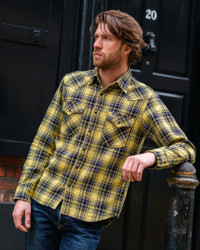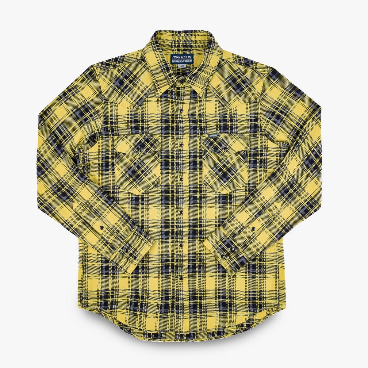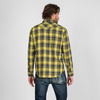 Offering a lighter weight alternative to our signature Ultra Heavy Flannel (UHF) shirts, our 9oz selvedge unbrushed flannels provide classic Iron Heart styling in a cooler, more breathable option for the warmer months. This season’s shirts feature a timeless check pattern, seen here in our western cut with an eye-catching yellow/indigo colourway. Slowly woven to increase heft and texture, the darkest yarns in the pattern are indigo dyed while the lighter shades are sulphur cheese-dyed to allow for natural fading over time. With only four shuttle looms in Japan capable of producing this intricate pattern (which requires switching the weft yarn mid-weave), our SS25 shirts are some of the most unique Japanese-made flannels available this season. Details - Made in Japan - Western shirt - 9oz selvedge unbrushed cotton flannel - 100% cotton - Indigo / sulphur cheese dyed warp and weft - will fade with wear and washing - Tonal stitching and bar tacks - Black Iron Heart logo’d Permex snaps (which can be upgraded with a choice of alternative ‘lightweight’ snaps) - Button at the collar (which can also be upgraded with 12mm, 13mm or 15mm GOOD ART HLYWD buttons) - Western-style flap patch pockets with snap fastenings - Single, double and triple needle stitch construction - Western-style front and back yokes - Felled internal seams - Selvedge placket and cuff ID - Red bobbin thread - One-washed - no shrinkage expected - Model Rudi wears Large - To see what sizes the crew wear, click here