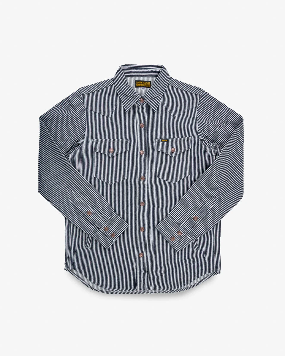 This western-style CPO shirt is made from 12oz sulphur-dyed hickory stripe cotton twill — the same fabric as our longest-running shirt model, the IHSH-07. Because it is woven with sulphur-dyed indigo yarns, you can expect the fabric to fade with wear, developing a wonderful vintage character over time. As the CPO variation of the IHSH-07, this shirt offers a little more length in the body than our standard western cut, with additional side hand-warmer pockets and heavy-duty copper snap fastenings throughout. Made In Japan - Designed by Shinichi Haraki, handmade by WORKS INC. in Japan 12oz Japanese Hickory Stripe - 100% cotton - Twill weave - Indigo sulphur-dyed warp / white weft - This fabric will fade with vintage character through wear and washing Cut & Features - CPO western shirt - Slim fit with slightly longer body - Snap fastenings - Flap down chest pockets - Handwarmer pockets - Western-style front and back yokes - Curved hem Constructional Stitching - Single, double and triple needle stitching - Poly/cotton thread for enhanced strength and durability - Bar tack pocket reinforcements - Chainstitched side seams - Felled internal seams Optional Upgrades This garment is fitted with Iron Heart branded oversized copper snap fastenings. Want to customise? Upgrade with a choice of alternative ‘heavyweight’ snap options when you add to cart Model Sizing - Model Michael is wearing a Large One-Washed - Post construction, we wash the completed garment in an aggressive industrial washing machine. This process removes virtually all potential shrinkage. - No further shrinkage is expected when washed according to our care guidelines Care Guidelines - We recommend washing this garment at 30°C with a low (or no) spin cycle. Hang dry, do not tumble dry