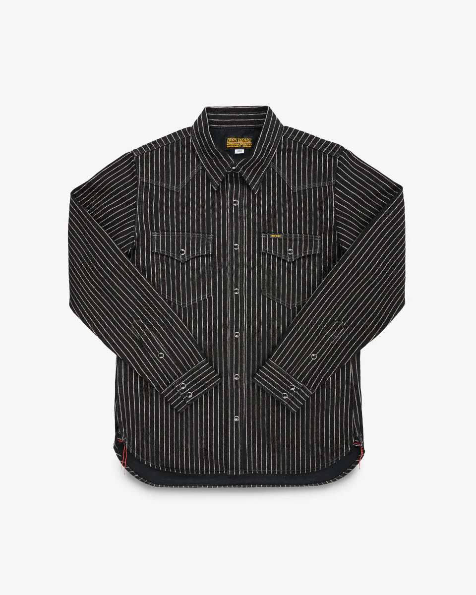 Our classic western cut shirt made from a 12oz black wabash fabric, the weft and the warp are both rope dyed black and the dots are bleached into the fabric post-weave. This shirt will fade and age beautifully. Made In Japan - Designed by Shinichi Haraki, handmade by WORKS INC. in Japan 12oz Japanese Wabash - A traditional workwear fabric that dates back to the 1800s - 100% cotton - Twill weave - Rope-dyed warp and weft yarns - Post-weave, the dots are bleached onto the face of the fabric - This fabric will fade with vintage character through wear and washing Cut & Features - Western shirt - Slim fit - Snap fastenings - Flap down chest pockets - Western-style front and back yokes - Curved hem Optional Upgrades This garment is fitted with Iron Heart branded Permex snap fastenings. Want to customise? Upgrade with a choice of alternative 'heavyweight' snap options when you add to cart Constructional Stitching - Single, double and triple needle stitching - Poly/cotton thread for enhanced strength and durability - Bar tack pocket reinforcements - Chainstitched side seams - Felled internal seams Model Sizing Model Sam is wearing Large One-Washed Wabash Shrinkage - To reduce the risk of shrinkage, we wash the completed garment in an aggressive industrial washing machine. This process removes virtually all potential shrinkage. - Negligible shrinkage expected when washed in accordance to our care guidelines Care Guidelines - We recommend washing this garment at 30°C with a low (or no) spin cycle. Hang dry, do not tumble dry