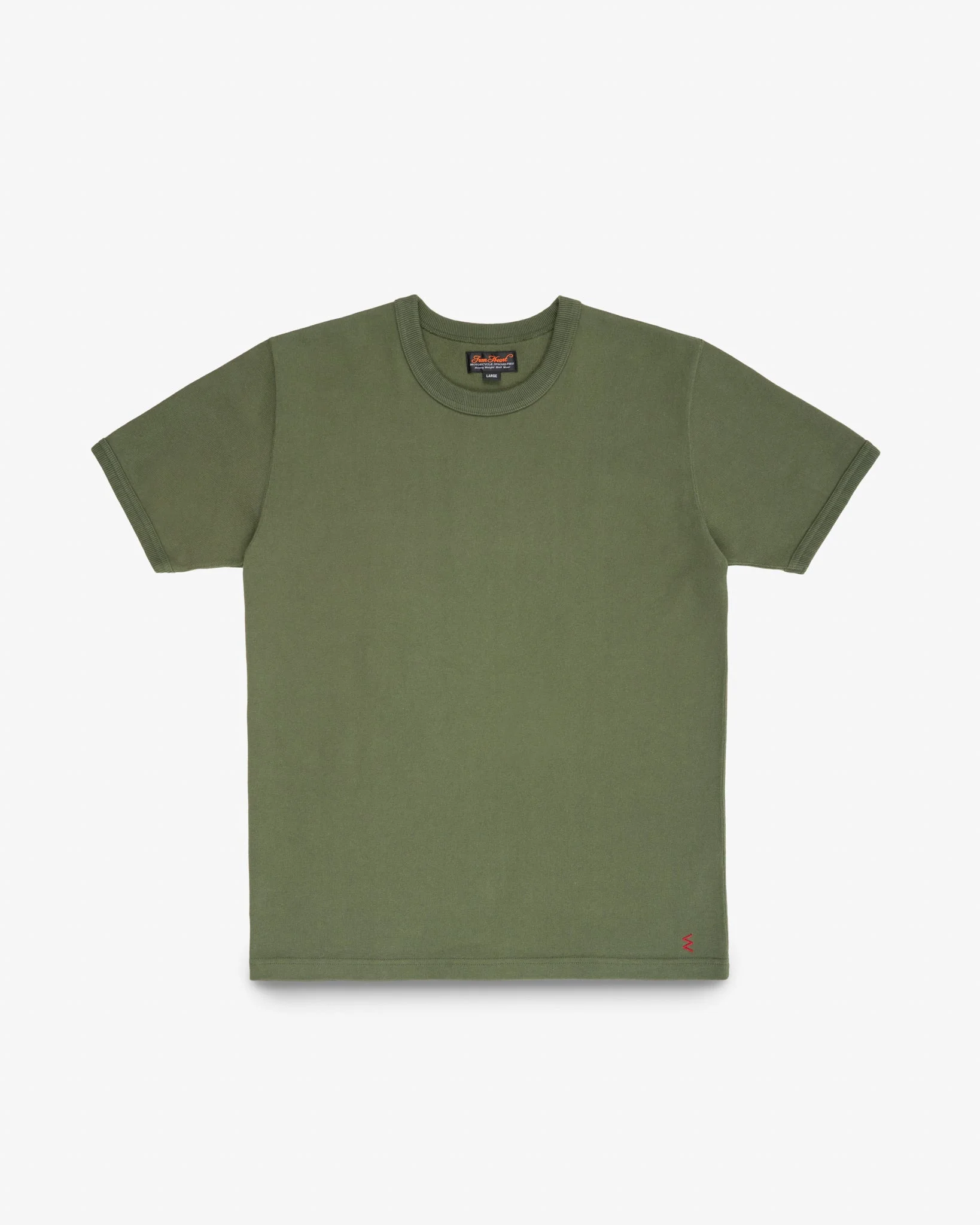 Heavyweight short-sleeved crew neck T-Shirt in 11oz knitted cotton with iconic red 'W'. Available in four colourways. So heavy, it's almost rude to call it “just” a T-Shirt. Made In Japan - Designed by Shinichi Haraki, handmade by WORKS INC. in Japan 11oz Japanese Cotton Knit - 100% cotton - Reactive-dyed warp and weft yarns Cut & Construction - Short sleeved T-shirt - Crew neck - Ribbed collar and cuffs - Poly/cotton stitching One-Washed - Post construction, we wash the completed garment in an aggressive industrial washing machine. This process removes virtually all potential shrinkage. - No further shrinkage is expected when washed according to our care guidelines Care Guidelines - We recommend washing this garment at 30°C with a low (or no) spin cycle. Hang dry, do not tumble dry