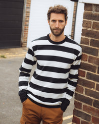 Heavyweight long-sleeved knitted cotton sweater with statement stripes. One-washed to minimize/eliminate shrinkage. So heavy, it's almost rude to call it “just” a sweater. Made In Japan - Designed by Shinichi Haraki, handmade by WORKS INC. in Japan 11oz Japanese Cotton Knit - 100% cotton - Reactive-dyed warp and weft yarns Cut & Construction - Long sleeved sweater/T-shirt - Crew neck - Ribbed collar and elasticated cuffs - Poly/cotton stitching Model Sizing Model Max is wearing Large One-Washed - Post construction, we wash the completed garment in an aggressive industrial washing machine. This process removes virtually all potential shrinkage. - No further shrinkage is expected when washed according to our care guidelines Care Guidelines - We recommend washing this garment at 30°C with a low (or no) spin cycle. Hang dry, do not tumble dry