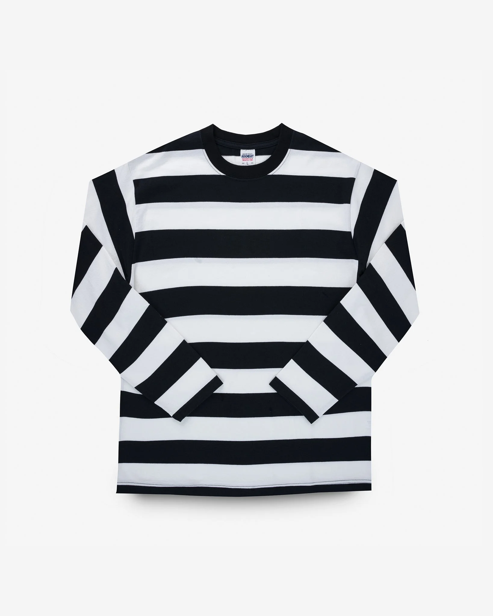 Constructed from a hefty 7.5oz cotton knit, this distinctive long-sleeved t-shirt is supremely soft, yet extremely durable. Features include chainstitched shoulder seams for increased strength, a ribbed crew neck and bold black and white stripes throughout. Made In Japan - Designed by Shinichi Haraki, handmade by WORKS INC. in Japan 7.5oz Japanese Loopwheel Cloth - 100% cotton - Knitted on vintage loopwheel machines in Wakayama, Japan - Reactive-dyed warp and weft yarns - Fade-resistant finish to ensure a steadfast colour Crew Neck Border Tee - Features & Construction - Long sleeved t-shirt - Ribbed crew neck - Chainstitched, reinforced shoulder seams One-Washed - Post construction, we wash the completed garment in an aggressive industrial washing machine. This process removes virtually all potential shrinkage. - No further shrinkage is expected when washed according to our care guidelines Care Guidelines - We recommend washing this garment at 30°C with a low (or no) spin cycle. Hang dry, do not tumble dry