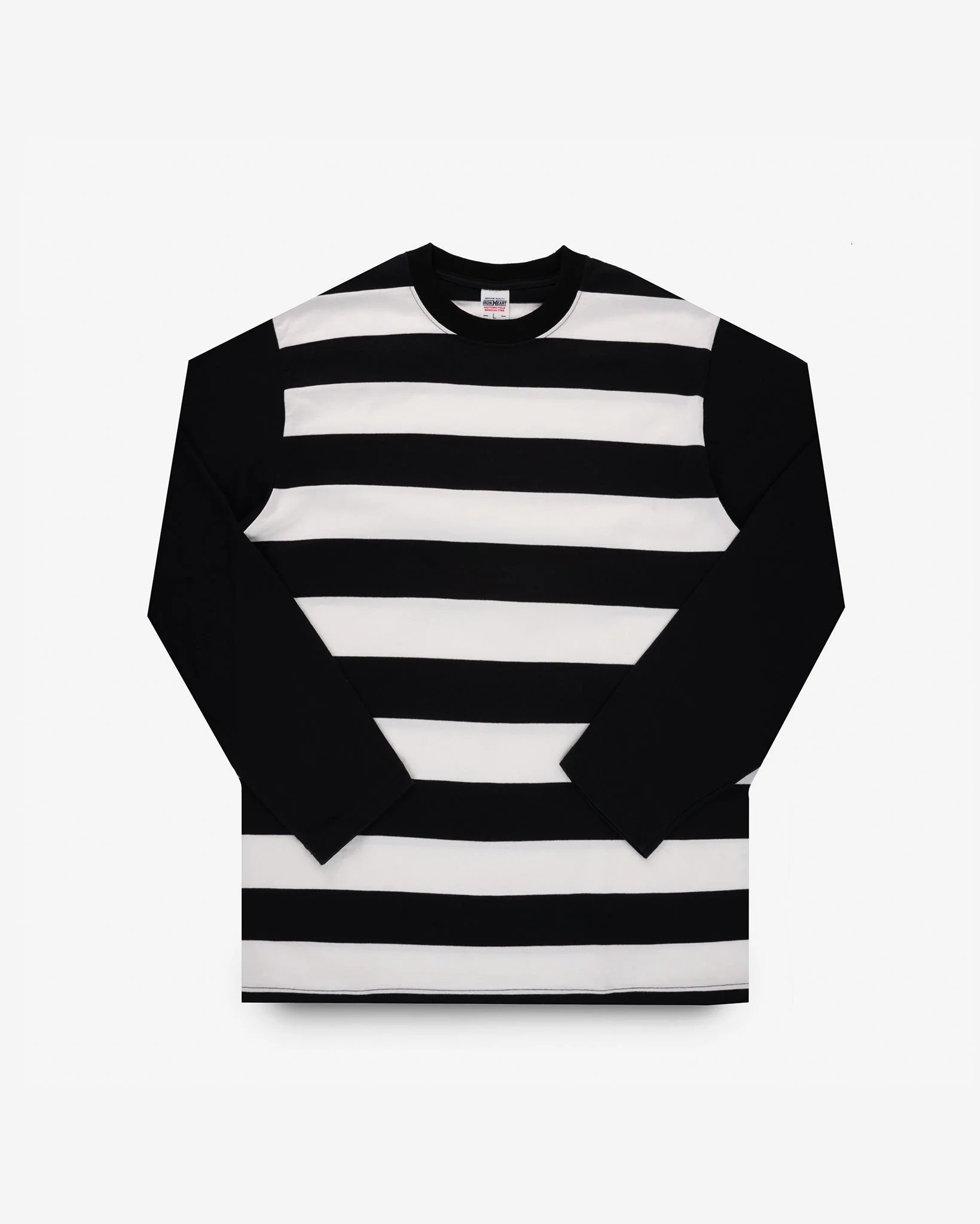 Constructed from a hefty 7.5oz cotton knit, this distinctive long-sleeved t-shirt is supremely soft, yet extremely durable. Features include chainstitched shoulder seams for increased strength, a ribbed crew neck and a bold black and white striped body. Made In Japan - Designed by Shinichi Haraki, handmade by WORKS INC. in Japan 7.5oz Japanese Loopwheel Cloth - 100% cotton - Knitted on vintage loopwheel machines in Wakayama, Japan - Reactive-dyed warp and weft yarns - Fade-resistant finish to ensure a steadfast colour Crew Neck Border Tee - Features & Construction - Long sleeved t-shirt - Ribbed crew neck - Chainstitched, reinforced shoulder seams One-Washed - Post construction, we wash the completed garment in an aggressive industrial washing machine. This process removes virtually all potential shrinkage. - No further shrinkage is expected when washed according to our care guidelines Care Guidelines - We recommend washing this garment at 30°C with a low (or no) spin cycle. Hang dry, do not tumble dry