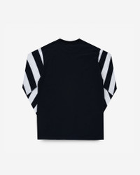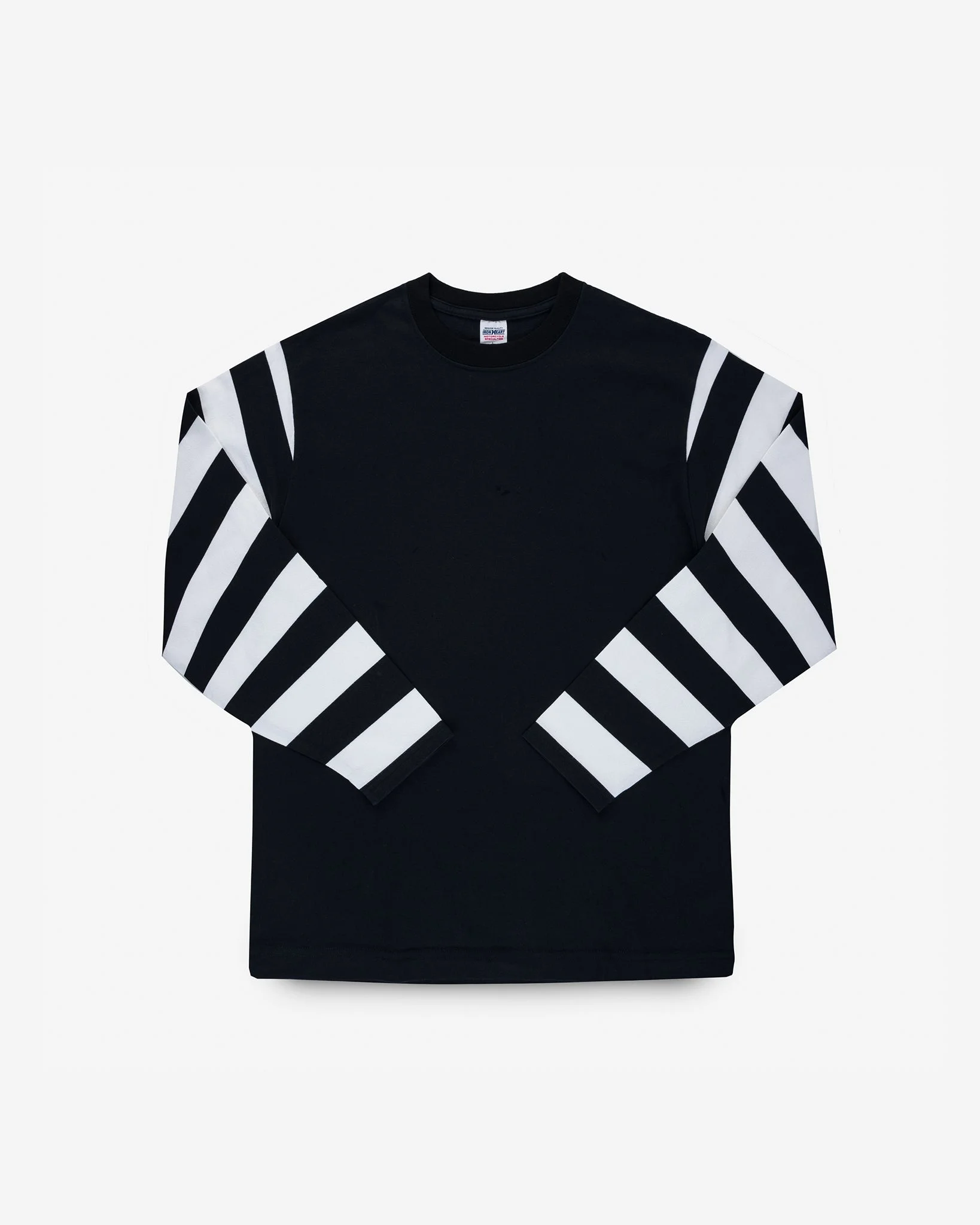 Constructed from a hefty 7.5oz cotton knit, this distinctive long-sleeved t-shirt is supremely soft, yet extremely durable. Features include chainstitched shoulder seams for increased strength, a ribbed crew neck and black and white striped arms. Made In Japan - Designed by Shinichi Haraki, handmade by WORKS INC. in Japan 7.5oz Japanese Loopwheel Cloth - 100% cotton - Knitted on vintage loopwheel machines in Wakayama, Japan - Reactive-dyed warp and weft yarns - Fade-resistant finish to ensure a steadfast colour Crew Neck Border Tee - Features & Construction - Long sleeved t-shirt - Ribbed crew neck - Chainstitched, reinforced shoulder seams One-Washed - Post construction, we wash the completed garment in an aggressive industrial washing machine. This process removes virtually all potential shrinkage. - No further shrinkage is expected when washed according to our care guidelines Care Guidelines - We recommend washing this garment at 30°C with a low (or no) spin cycle. Hang dry, do not tumble dry