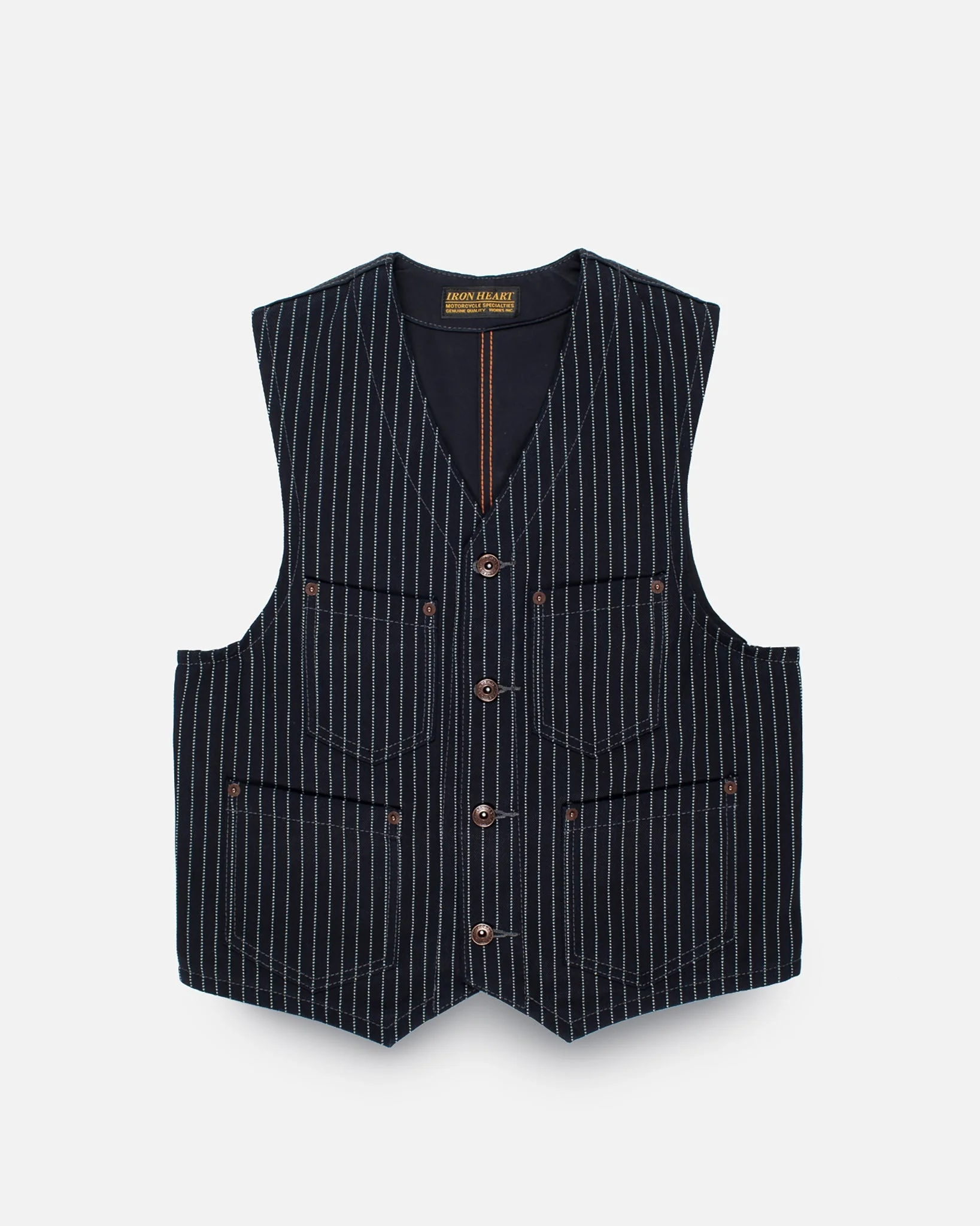 This 12oz work vest is constructed using a indigo sulphur dyed wabash face, backed with a navy duck canvas. Easily layered over a t-shirt in the spring or under a jacket in the winter, it’s a solid all year-round piece, and with the warp and weft both being rope dyed, you are sure to see plenty of evolution the more it is worn. Made In Japan - Designed by Shinichi Haraki, handmade by WORKS INC. in Japan 12oz Japanese Wabash - A traditional workwear fabric that dates back to the 1800s - 100% cotton - Twill weave - Rope-dyed warp and weft yarns - Post-weave, the dots are bleached onto the face of the fabric - This fabric will fade with vintage character through wear and washing Features & Construction - Two chest pockets - Two waist pockets - Iron Heart branded tack button fastenings - Cotton duck back - Rear buckle cinch - Copper reinforcement rivets - Felled seams throughout Model Sizing Model Johnny wears Large One-Washed Wabash Shrinkage - To reduce the risk of shrinkage, we wash the completed garment in an aggressive industrial washing machine. This process removes virtually all potential shrinkage. - Negligible shrinkage expected when washed in accordance to our care guidelines Care Guidelines - We recommend washing this garment at 30°C with a low (or no) spin cycle. Hang dry, do not tumble dry