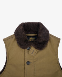 Our N1 vest is based on the classic deck jacket of the same name, as issued to US Navy servicemen during the 1940s. Constructed from hardwearing 12oz whipcord with a wool/alpaca lining, this is an incredibly warm and windproof vest for cold winter days - the classic military styling of the original N1 deck jacket, with the layering versatility of a body warmer. For this FW24 release, we’ve tweaked the design slightly, removing the ‘D’ stitching around the pockets to create a cleaner aesthetic. Made In Japan - Designed by Shinichi Haraki, handmade by WORKS INC. in Japan 12oz Japanese Whipcord - 100% cotton - Twill weave - Woven with hard twisted yarns - Reactive-dyed warp and weft - Fade-resistant finish to ensure a steadfast colour Cut & Features - Inspired by the original 1940s US Navy design - High density, long pile 80% wool / 20% alpaca lining - Hidden interlining for increased wind resistance - Two-way main zipper with button fastening placket - Wool lined handwarmer pockets with snap fastenings - Internal ‘gun’ pocket with snap fastening - Button fastening cinches and throat latch Hardware & Construction - Overspec’d two-way YKK zipper - Heavy-duty snap fastening pockets - Poly/cotton stitching - Single and double needle construction - Internal felled seams Model Sizing Model Johnny wears Large Care Guidelines - Dry clean (with petroleum solvent) only - Outer material can be spot cleaned by hand with warm water - Do not machine wash or tumble dry - No shrinkage expected when washed according to these guidelines