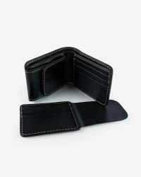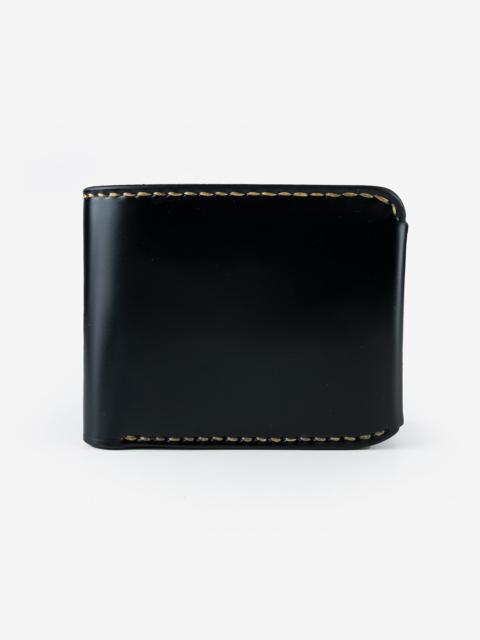 This small wallet is constructed using shell cordovan and hand-sewn by the ever-capable hands at Calf Japan. It features multiple card slots along with snap closure coin pocket. Made In Japan - Designed by Shinichi Haraki, handmade by WORKS INC. in Japan Small Shell Cordovan Wallet - Black Shell Cordovan - Inner black calf leather - Hand stitched - One bill slot - 3 primary card slots each side - 2 extra card slots behind card slots - Removable centre credit card leaf with 3 card slots on one side and 1 on the other - Snap fastened coin pocket - Length 4.5” (11.5cm), depth 3.5” (9cm) and thickness 1” (2.6cm) Shell Cordovan - Favoured by high-end shoemakers, Shell Cordovan is a premium horsehide leather known for its smooth texture, durability, and ability to develop a rich patina. It’s sourced from the tight-knit, fibrous shell layer on the horse's rump, giving the leather its smooth surface, strength and resistance to creasing - Due to it’s smooth surface, Shell Cordovan is prone to scratching — be mindful of sharp objects - This type of leather already contains a high liquor content impregnated during the tanning process. It is important not to use too much polish when caring for your cordovan. We advise conditioning the leather very occasionally to prevent cracking, applying a small amount of leather conditioner or a specialised Shell Cordovan cream. Be careful not to over-condition, as this will result in a build-up of wax that will scratch easily, attract dirt and leave unsightly creases - To clean Shell Cordovan, use a soft, dry cloth to gently wipe off dust and dirt. Regularly buff the surface with a soft cloth if you wish to maintain its shine. For deeper cleaning, use a damp cloth with a small amount of mild soap. Always avoid soaking the leather. If it does get wet, blot the leather dry with a cloth and leave to air dry naturally — never dry with a heater or hairdryer