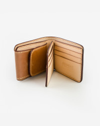 This small wallet is constructed using shell cordovan and hand-sewn by the ever-capable hands at Calf Japan. It features multiple card slots along with snap closure coin pocket. Made In Japan - Designed by Shinichi Haraki, handmade by WORKS INC. in Japan Small Shell Cordovan Wallet - Black Shell Cordovan - Inner black calf leather - Hand stitched - One bill slot - 3 primary card slots each side - 2 extra card slots behind card slots - Removable centre credit card leaf with 3 card slots on one side and 1 on the other - Snap fastened coin pocket - Length 4.5” (11.5cm), depth 3.5” (9cm) and thickness 1” (2.6cm) Shell Cordovan - Favoured by high-end shoemakers, Shell Cordovan is a premium horsehide leather known for its smooth texture, durability, and ability to develop a rich patina. It’s sourced from the tight-knit, fibrous shell layer on the horse's rump, giving the leather its smooth surface, strength and resistance to creasing - Due to it’s smooth surface, Shell Cordovan is prone to scratching — be mindful of sharp objects - This type of leather already contains a high liquor content impregnated during the tanning process. It is important not to use too much polish when caring for your cordovan. We advise conditioning the leather very occasionally to prevent cracking, applying a small amount of leather conditioner or a specialised Shell Cordovan cream. Be careful not to over-condition, as this will result in a build-up of wax that will scratch easily, attract dirt and leave unsightly creases - To clean Shell Cordovan, use a soft, dry cloth to gently wipe off dust and dirt. Regularly buff the surface with a soft cloth if you wish to maintain its shine. For deeper cleaning, use a damp cloth with a small amount of mild soap. Always avoid soaking the leather. If it does get wet, blot the leather dry with a cloth and leave to air dry naturally — never dry with a heater or hairdryer