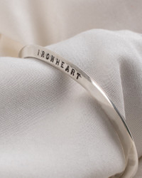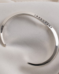 Made from solid sterling .925 silver, our "V" profile bangle features a triangular cross section which gently tapers and flattens out towards each end. Simple "IRON HEART" lettering is debossed onto one face, creating a subtle, yet striking piece. Made In Japan - Designed by Shinichi Haraki, handmade by WORKS INC. in Japan Iron Heart "V" Profile Bangle - Sterling Silver - Solid sterling .925 Silver - Triangular cross section, flattening out towards each end - "IRON HEART" debossed on outer face - Length 5.1” (13.5cm), width 0.16" (0.4cm), thickness 0.2” (0.7cm)