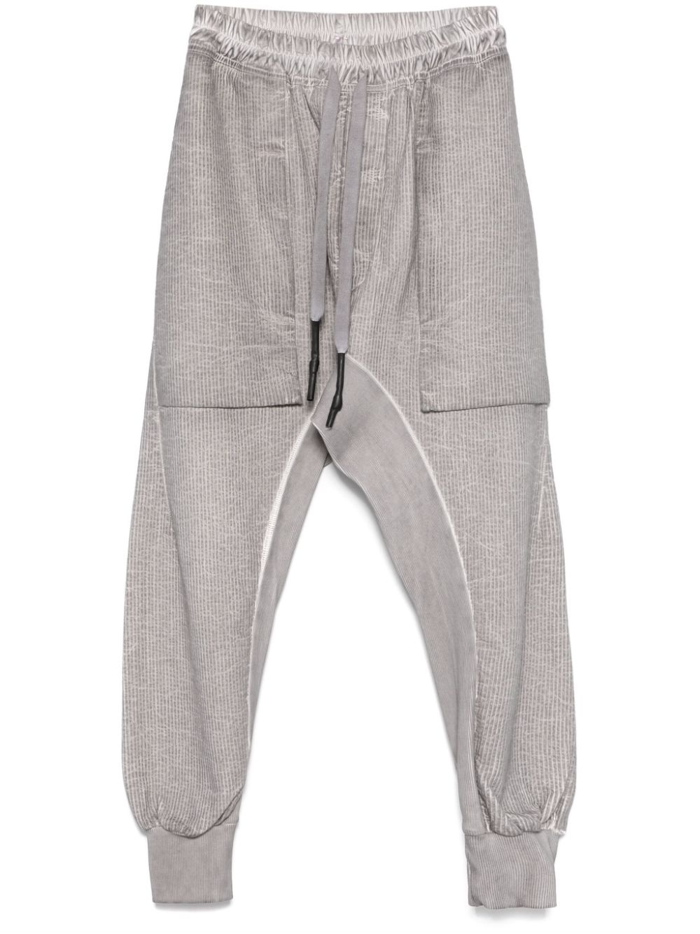Gusset Stripe Plomb trousers Highlights - Timberwolf grey - Organic cotton - Elasticated waistband with internal drawstring - Spray-paint effect - Vertical stripe pattern - Two side slash pockets - Front zip fastening pockets - Drop crotch - Ribbed-knit panel - Ribbed ankles - Rear patch pocket - Tapered leg - This item is made from at least 50% organic materials. - Learn more about what makes a product conscious on our conscious criteria page Made in France Composition Calf Leather 100%, Organic Cotton 100%