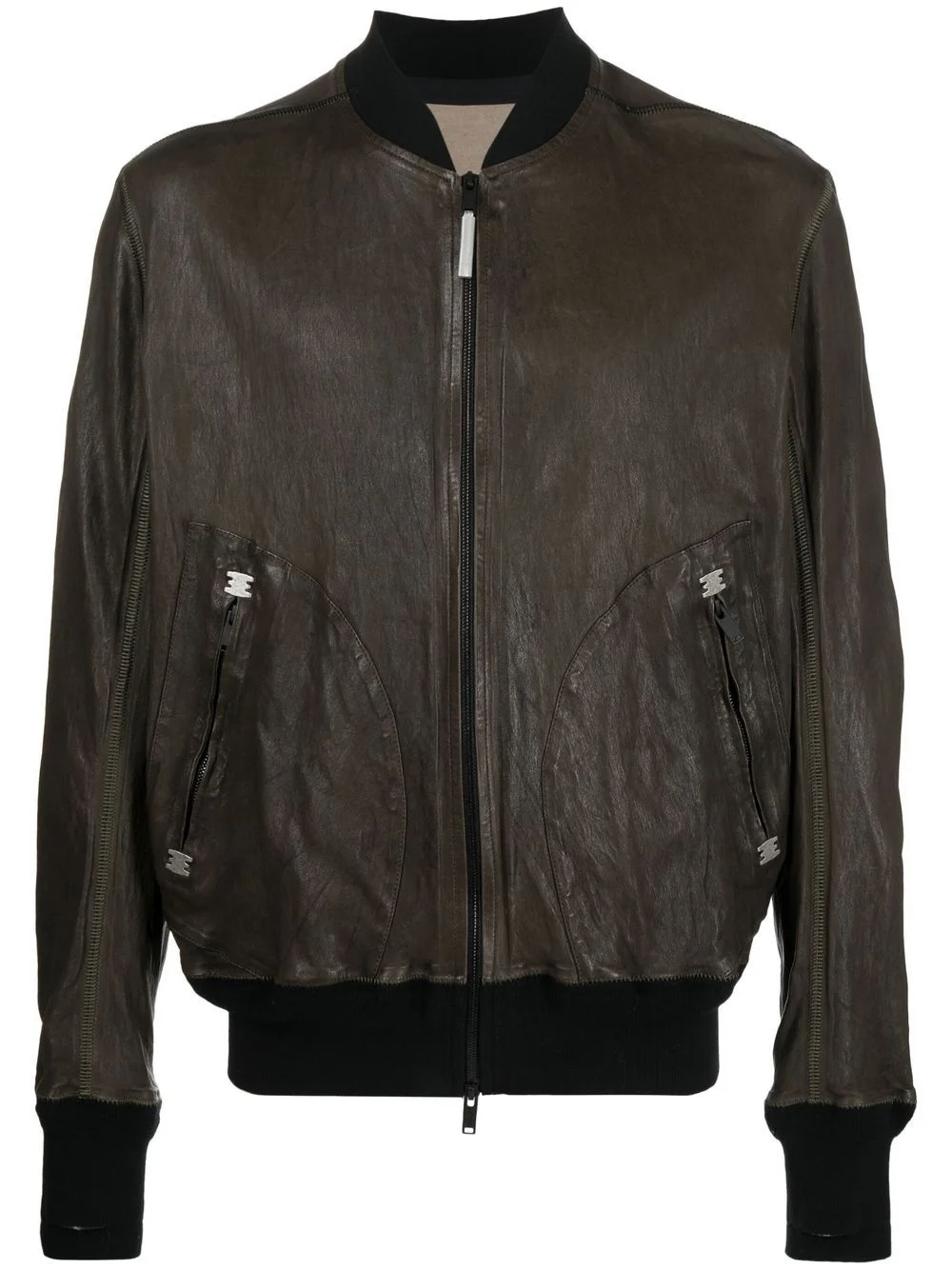 zip-detail leather jacket khaki green lambskin zip detail two side zip-fastening pockets front zip fastening band collar long sleeves elasticated cuffs elasticated hem Made in France Composition Lambskin 100% SIZE & FIT Model measurements Height 6 ft 1 in(1.85 m) Bust/Chest 35.82 in(91 cm) Hips 37.79 in(96 cm) Waist 29.13 in(74 cm) FittingInformation This piece fits true to size. We recommend you get your regular size Cut for a loose fit Made with a mid-weight fabric Washing instructions Specialist Cleaning