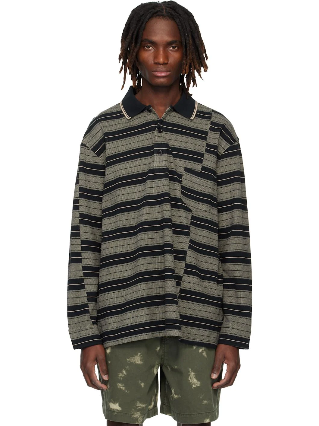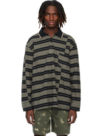 Cotton pique polo. · Stripes throughout · Paneled construction · Rib-knit spread collar · Three-button placket · Patch pocket at chest · Tennis-tail hem · Dropped shoulders · Buttoned barrel cuffs · Logo embroidered at back collar Supplier color: Black/Ecru 100% cotton. Made in Morocco 261600M212001