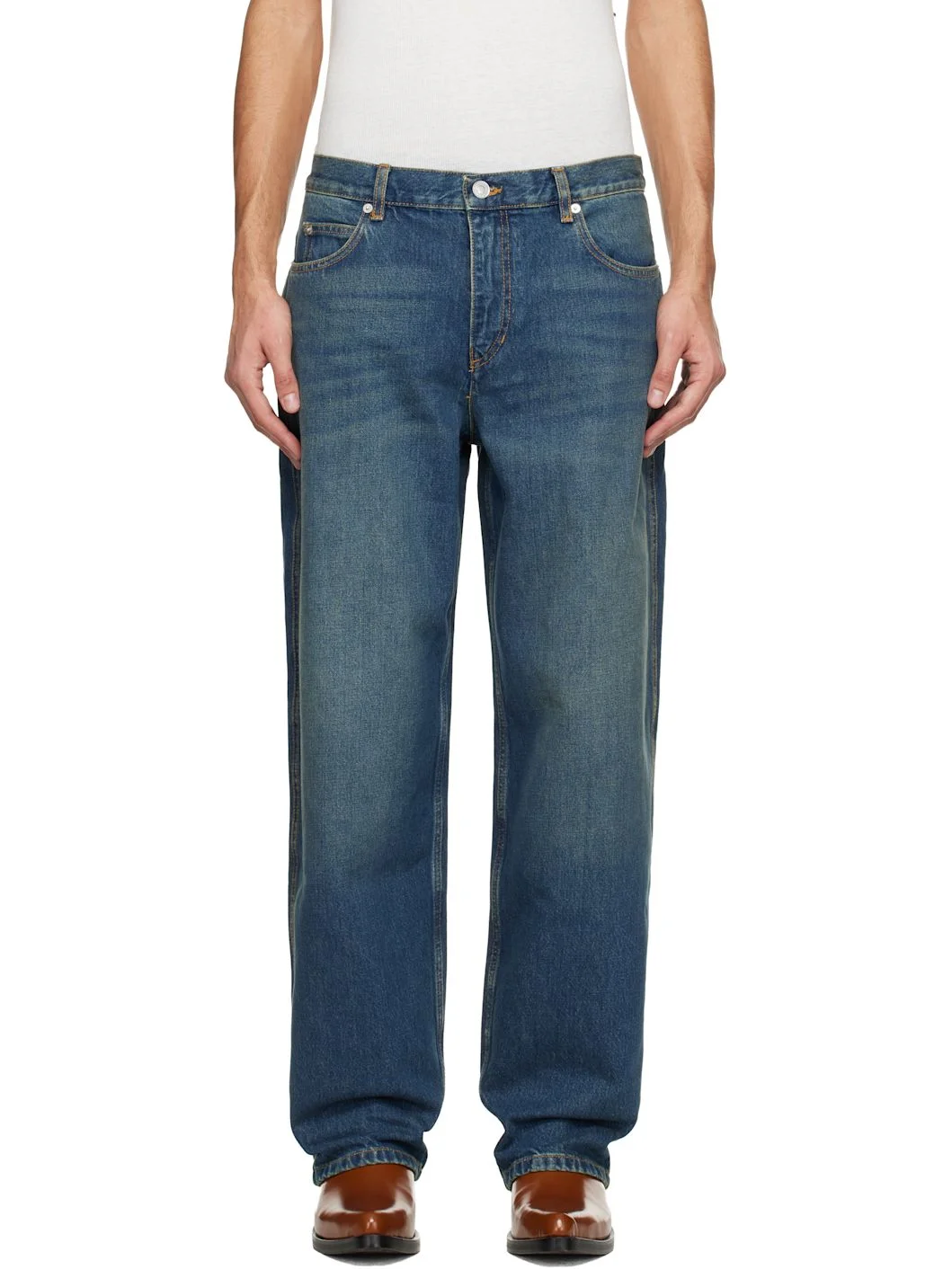 Non-stretch denim jeans. · Fading and whiskering throughout · Straight-leg · Belt loops · Five-pocket styling · Zip fly · Logo patch at back waistband · Logo-engraved silver-tone hardware · Contrast stitching in tan Supplier color: Faded blue 100% cotton. Made in Tunisia 261600M186007