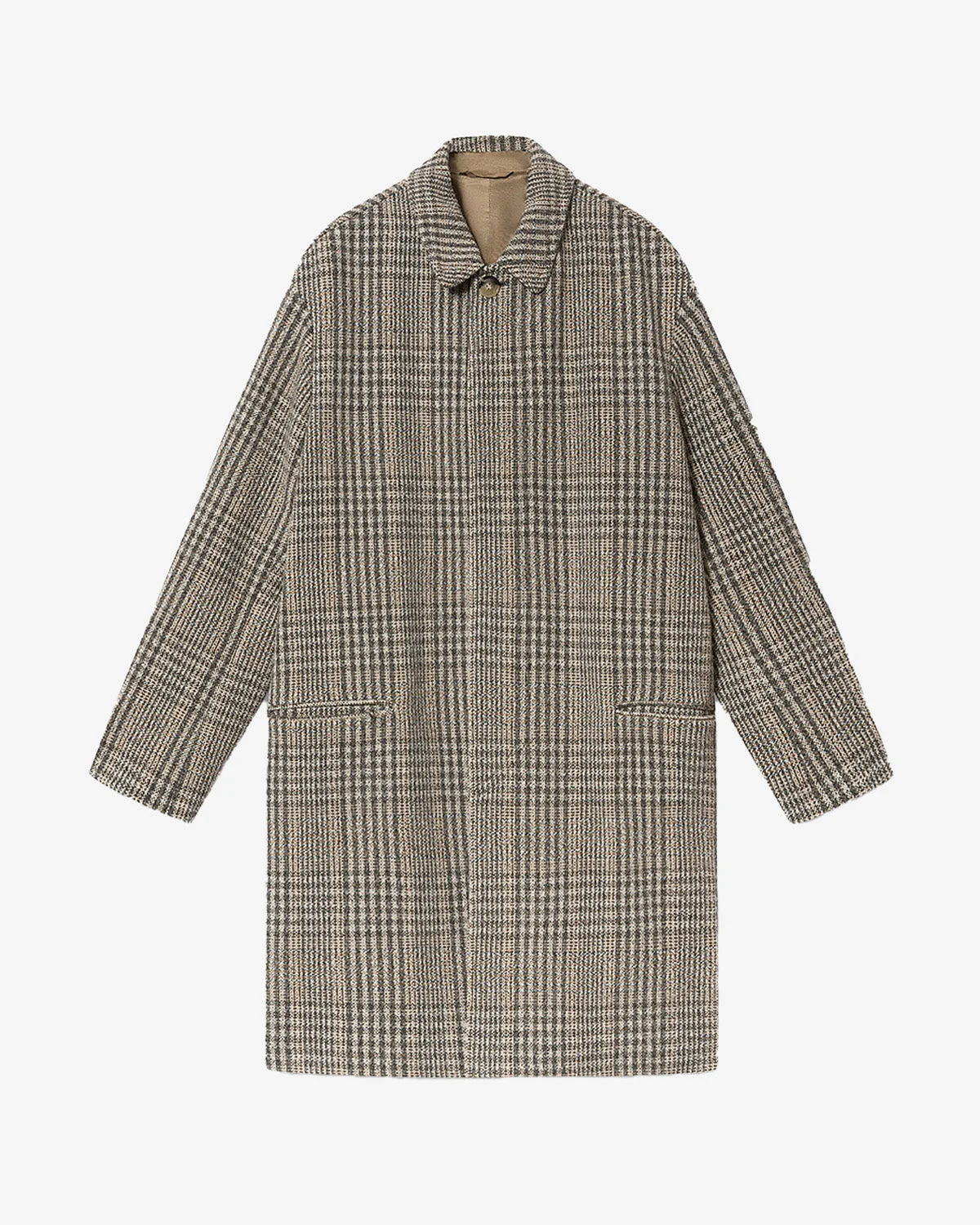 Long lightweight wool blend coat Turn-down collar Long sleeves with dropped armholes Piped flap pockets Prince-of-Wales check virgin wool Hidden button fastening with one visible button Straight cut, long lengthStyle: MA0528HAD1E02H90BE FRANCO 100% virgin wool Care & Sustainability Dry clean only For more details, see the instructions on the composition label the history and environmental impact of this product
